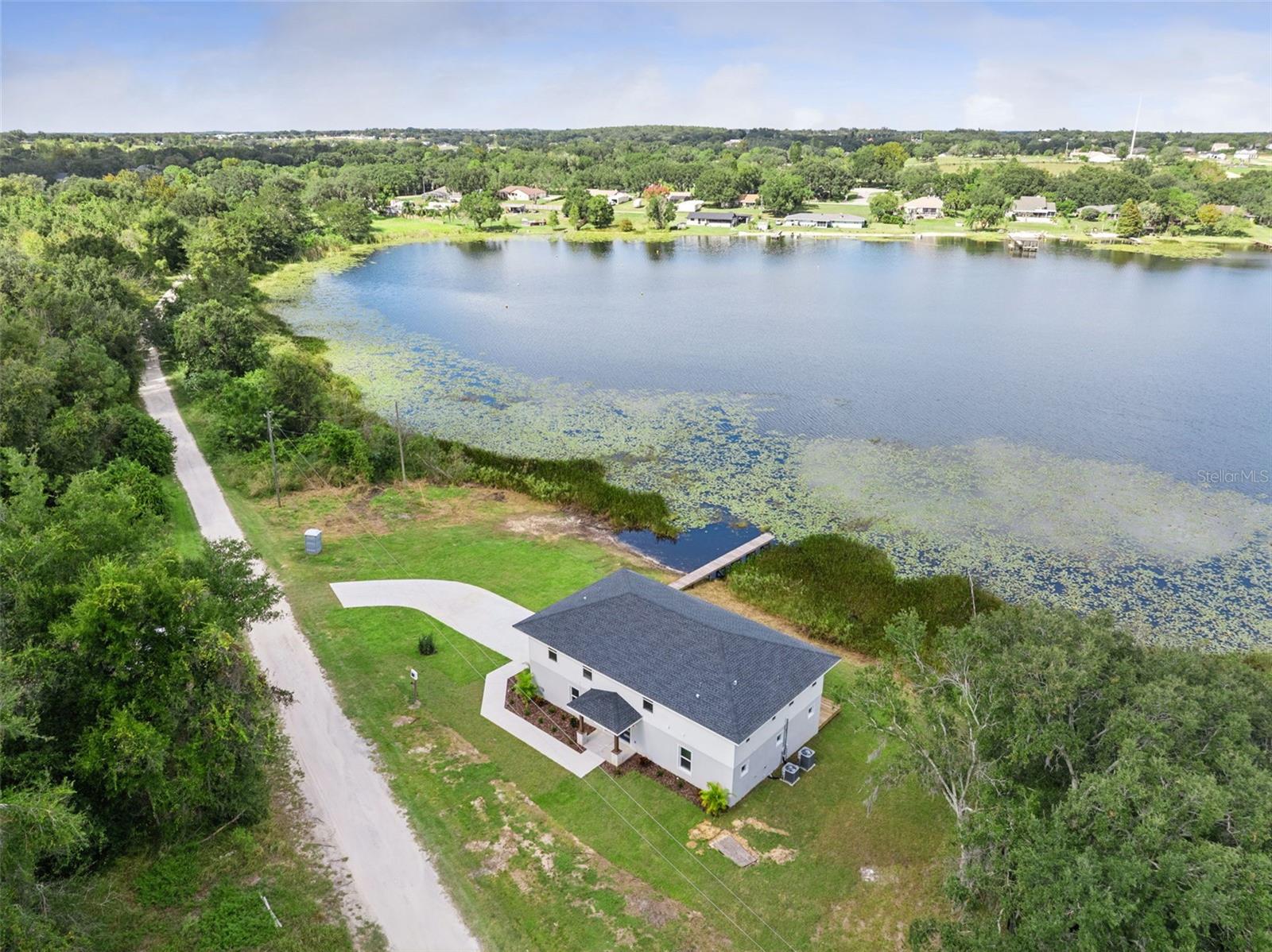 Discover the completely renovated lakefront lifestyle awaiting you at this beautiful 4 bedroom, 3 bathroom home on Autumn Ln in Clermont. From the moment you approach, the residence presents a captivating two-story exterior and a driveway running parallel to the water, where a private dock extends into the serene lake, offering stunning views and tranquil access for waterfront enjoyment, particularly beautiful at sunset. Step inside to find an interior bathed in natural light, featuring a modern, open-concept design and beautiful wood-look flooring that flows throughout the main living areas. The welcoming entryway sets a stylish tone with a contemporary staircase featuring light wood banisters and sleek black metal balusters, complemented by a chic white console and a circular mirror. The heart of the home is a seamless flow from the living room to the dining area, all enjoying spectacular lake views through expansive sliding glass doors. The living space is cozy and bright, perfect for relaxing while taking in the water scenery. The gourmet kitchen is a chef's delight, boasting ample light wood cabinetry, white quartz countertops, stainless steel appliances, and a large peninsula with a waterfall edge, providing plenty of prep space and a casual dining area, all while overlooking the lake through a window above the sink. Upstairs, the bedrooms continue the modern aesthetic with great natural light and peaceful views, including the primary bedroom which features a fantastic lake view, a contemporary ceiling fan, and a neutral color palette for a restful retreat. The luxurious bathrooms are fully updated, featuring modern vanities and high-end tile work, most notably a spacious walk-in shower with a glass enclosure and stunning scalloped marble-look tile, finished with contemporary matte black fixtures. This home is a perfect blend of modern luxury and idyllic lakefront living.
