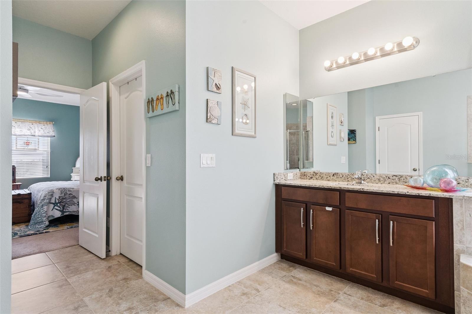 Eat-in Kitchen, High Ceilings, Kitchen/Family Room Combo, L Dining, Open Floorplan, Primary Bedroom Main Floor, Solid Surface Counters, Solid Wood Cabinets, Split Bedroom, Stone Counters, Thermostat, Walk-In Closet(s)