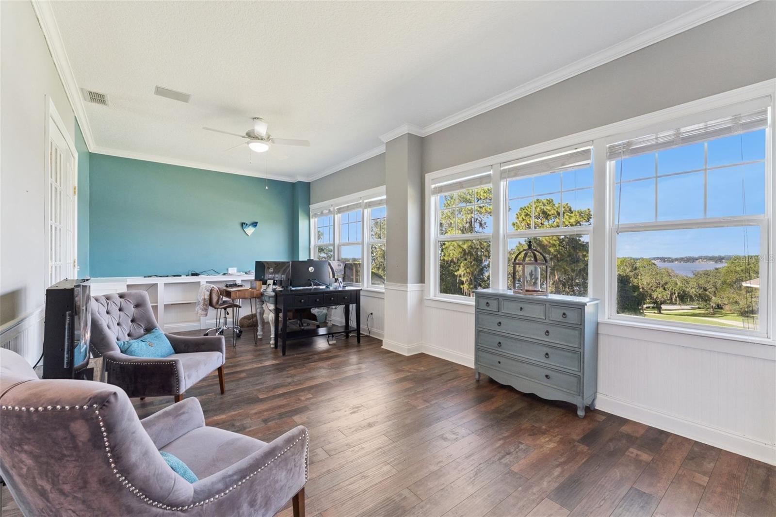 Welcome to this stunning one-of-a-kind residence in the sought-after Lake Ridge Club, a chain of lakes community, with modern luxury across nearly 5, 000 square feet of thoughtfully designed living space. This home features 6 bedrooms, 3.5 bathrooms, a spacious loft, and a fully finished basement that creates an entertainer's paradise perfect for multi-generational living or those who love to host. As you enter through the gorgeous double doors, the expansive living room and formal dining room w/soaring high ceilings welcome you into this remarkable home. The split floor plan ensures maximum privacy, with the heart of the home being the chef's dream kitchen that opens to the family room w/beautiful glimpses of Lake Minnehaha. This kitchen has custom solid wood stacked cabinetry w/elegant crown molding, granite countertops, newer stainless steel appliances including a WIFI-enabled touch screen refrigerator, a separate prep sink, and soft-close drawers providing ample storage. The generous breakfast nook and convenient breakfast bar make this space perfect for both casual family meals and entertaining guests. The main level features high-end waterproof laminate flooring throughout for durability and style, along with stunning newer windows that frame breathtaking lake views and spectacular sunsets. Two bedrooms and a full bathroom provide comfortable accommodations, while the recently remodeled guest bathroom and half-bath showcase custom vanities and charming modern farmhouse touches. The remodeled laundry room features designer tiles and butcher block countertops, plus a convenient mudroom for everyday living. Your personal sanctuary awaits in the expansive main bedroom suite, w/coffered ceilings and double doors that open to the massive loft or flex space. This versatile area offers endless possibilities as a home office, play area for little ones, sitting room, or homeschool space, all flooded with natural light from numerous windows and featuring stunning lake views. Step out onto the private balcony facing Lake Minnehaha to enjoy your morning coffee while watching gorgeous sunsets paint the sky. The en-suite bathroom is a masterpiece of luxury, complete w/dual walk-in closets, double vanities, and a large walk-in shower. The magic doesn't stop there. Adding a delightful touch of intrigue, a custom-built secret library door conceals a hidden stairway leading to the fully finished basement, an entertainment haven spanning over 2, 100 square feet. This lower level could easily be transformed into an in-law suite or next-gen living quarters and includes a second primary suite with a Jack-and-Jill bathroom, two additional bedrooms, a dedicated movie room complete with furniture, and a custom bar perfect for entertaining. The massive bonus or game room provides endless possibilities for recreation and relaxation. A screened-in porch off the downstairs level offers the perfect spot for outdoor relaxation, al fresco dining, and grilling, w/access to the spacious backyard. The property includes a 2-car side entry garage with ceiling-to-floor cabinetry for organized storage, plus an expanded driveway. The low HOA fee includes access to the clubhouse and community pool, and for an additional fee, storage is available for boats/jet skis/RVs. Please check out the virtual tour for a stunning drone video showcasing just how close this magnificent home is to the lake. Added bonus-this home has a $275K +/- assumable mortgage at 2.875%