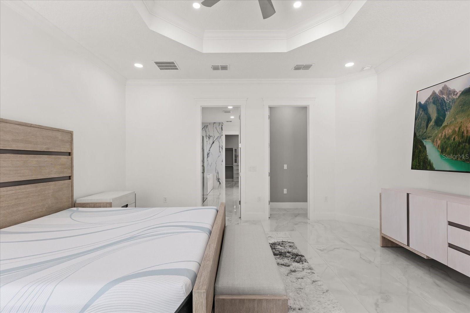 Ceiling Fans(s), Crown Molding, Eat-in Kitchen, High Ceilings, Kitchen/Family Room Combo, Primary Bedroom Main Floor, Solid Wood Cabinets, Split Bedroom, Stone Counters, Thermostat, Tray Ceiling(s)