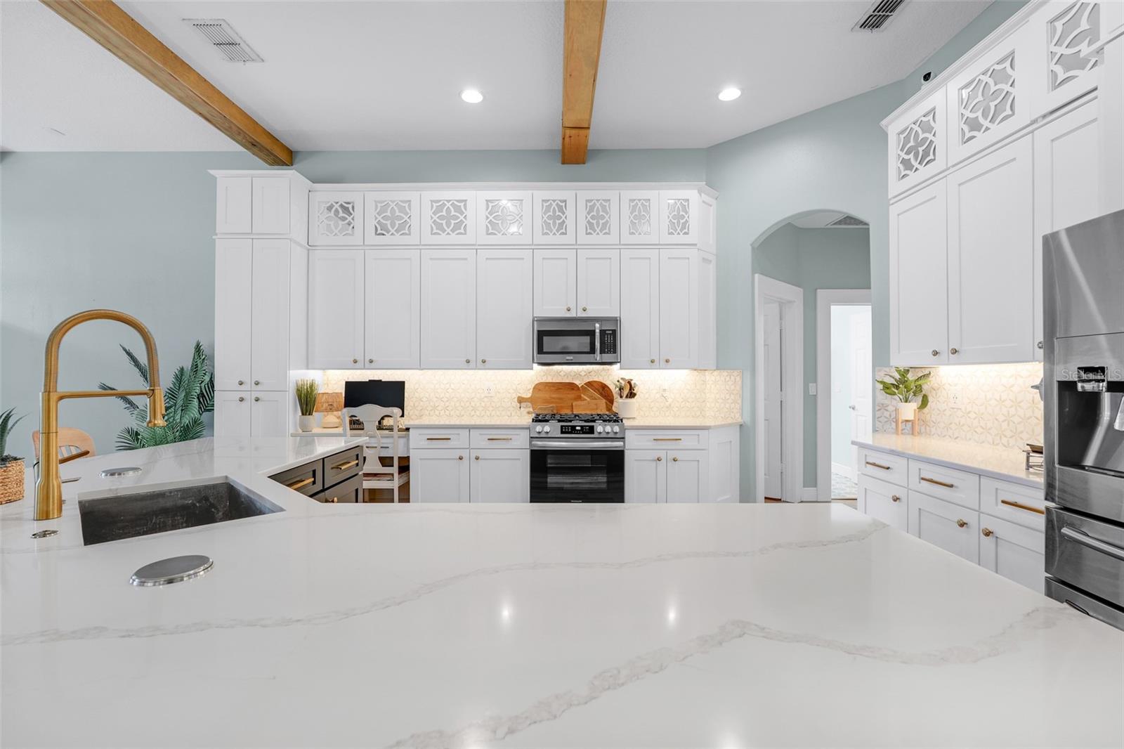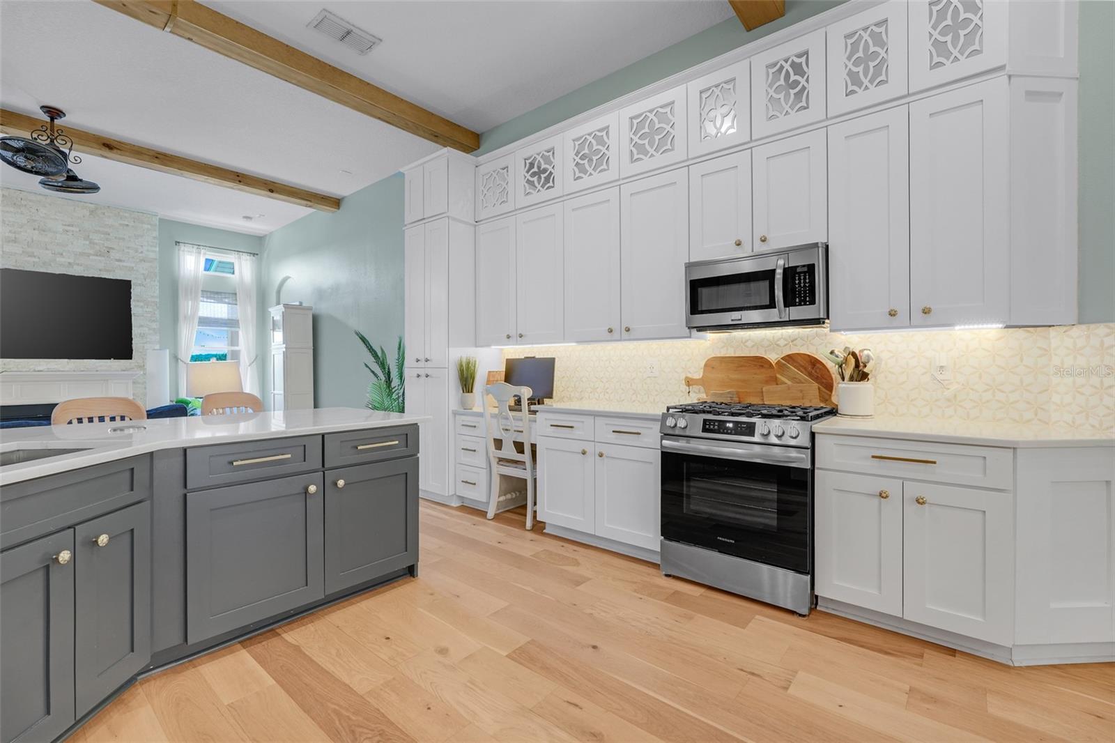 Step inside this beautifully updated residence where every detail has been thoughtfully elevated all within the last five years. Rich real White Oak hardwood floors flow seamlessly throughout the living spaces, accented by bullnose cornering, 5-inch baseboards (without quarter round), and elegant crown molding in the kitchen and living room. The open-concept design draws the eye upward to faux wood beams and soaring ceilings, while a sleek tile accent wall with faux fireplace and mounted TV creates the perfect centerpiece for relaxation or entertaining. The chef’s kitchen features newly refaced cabinetry with contrasting white uppers and deep blue base cabinets, a quartzite island with seating for five or more, and a stainless-steel farmhouse-style single-basin sink. Every detail shines—from the custom upper cabinets for additional storage, to the new stainless-steel appliances, modern backsplash, and upgraded lighting fixtures. Additional enhancements include wainscoting in the formal dining room, all new interior paint, updated door casings and molding, 10-foot exterior doors, and new ceiling fans throughout, including in the pool enclosure. Updated windows ensure energy efficiency, while the addition of a whole-home solar system dramatically reduces electric bills—from nearly $800 in peak summer months to just around $10 monthly. The home’s split floor plan offers privacy, with upgraded guest baths featuring new vanities, tile, and fixtures. The primary suite is a retreat with private pool access, two expansive walk-in closets (one with a custom organizer), and a spa-inspired ensuite featuring dual vanities, makeup station, walk-in shower, soaking tub, linen closet, and water closet. Enjoy year-round Florida living with a Gunite pool, hot tub, freshly repainted pool deck, and an added paver retaining wall with built-in seating overlooking serene Lost Lake—with no rear neighbors. A screened lanai expands the living space, while the 3-car garage with upgraded screen system creates the perfect spot for projects or game day. The home also boasts a newer roof, newer A/C, and freshly painted exterior, set on just over 1 acre of lush property. Don’t miss this rare opportunity to own a move-in ready, fully upgraded home on over an acre with breathtaking lake views. Schedule your private showing today! Please note: Some photos have been digitally enhanced.