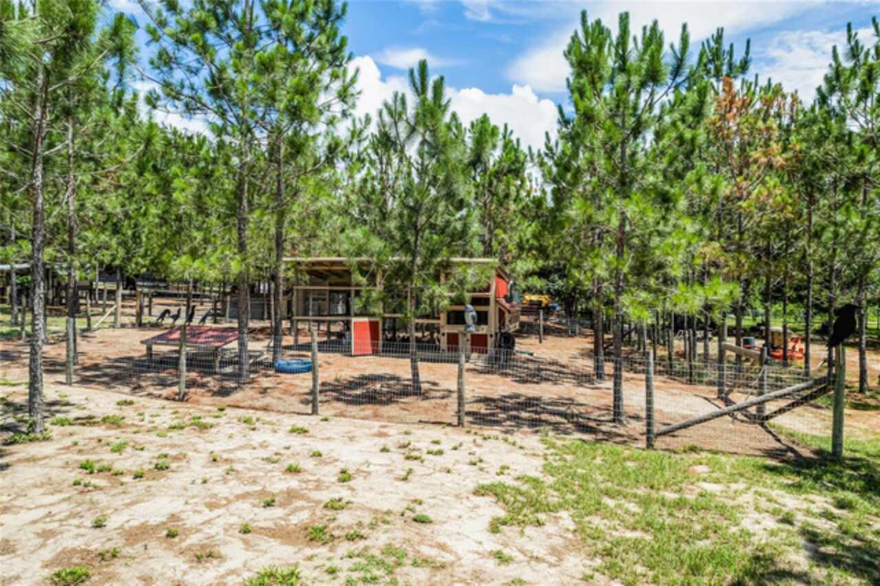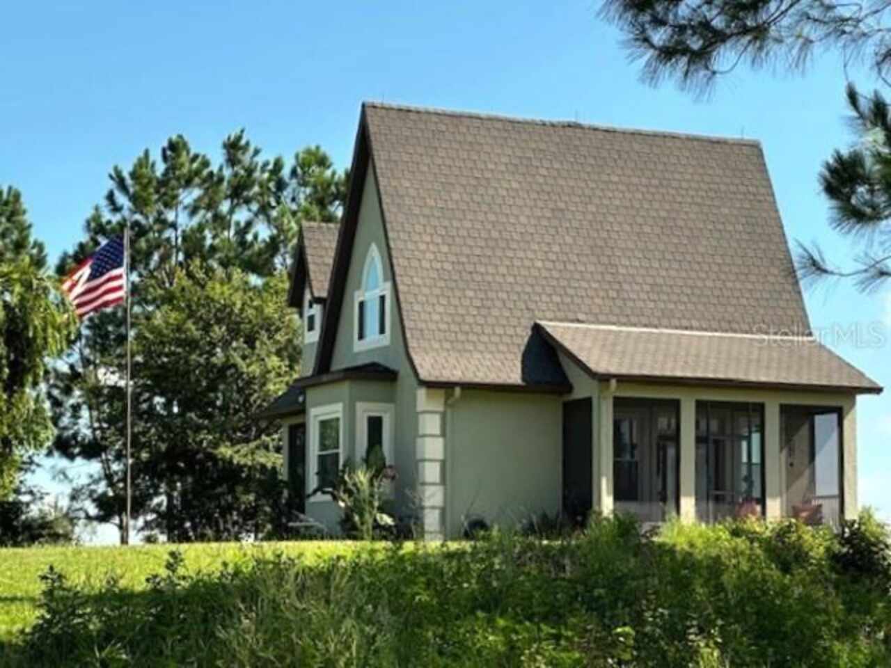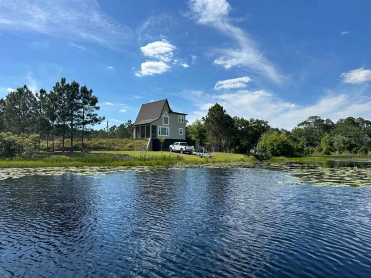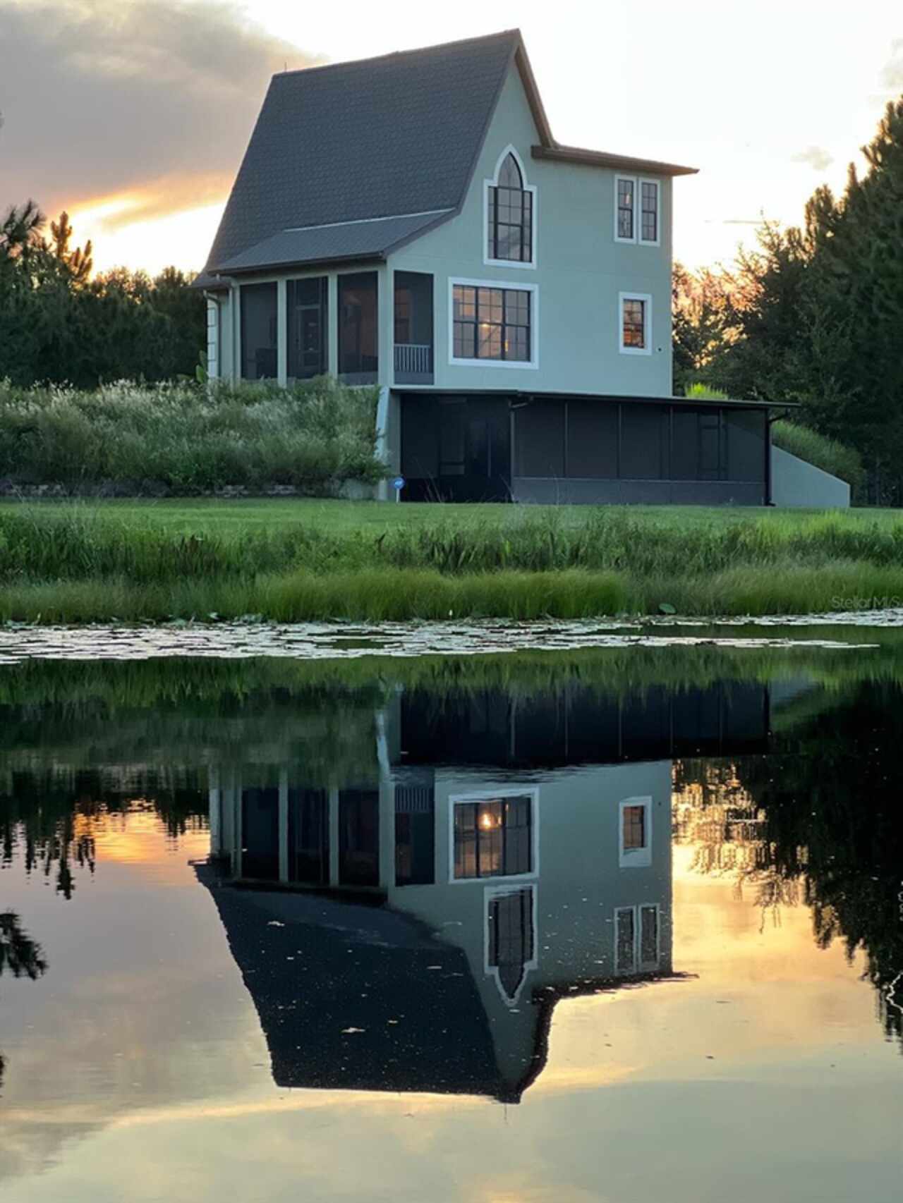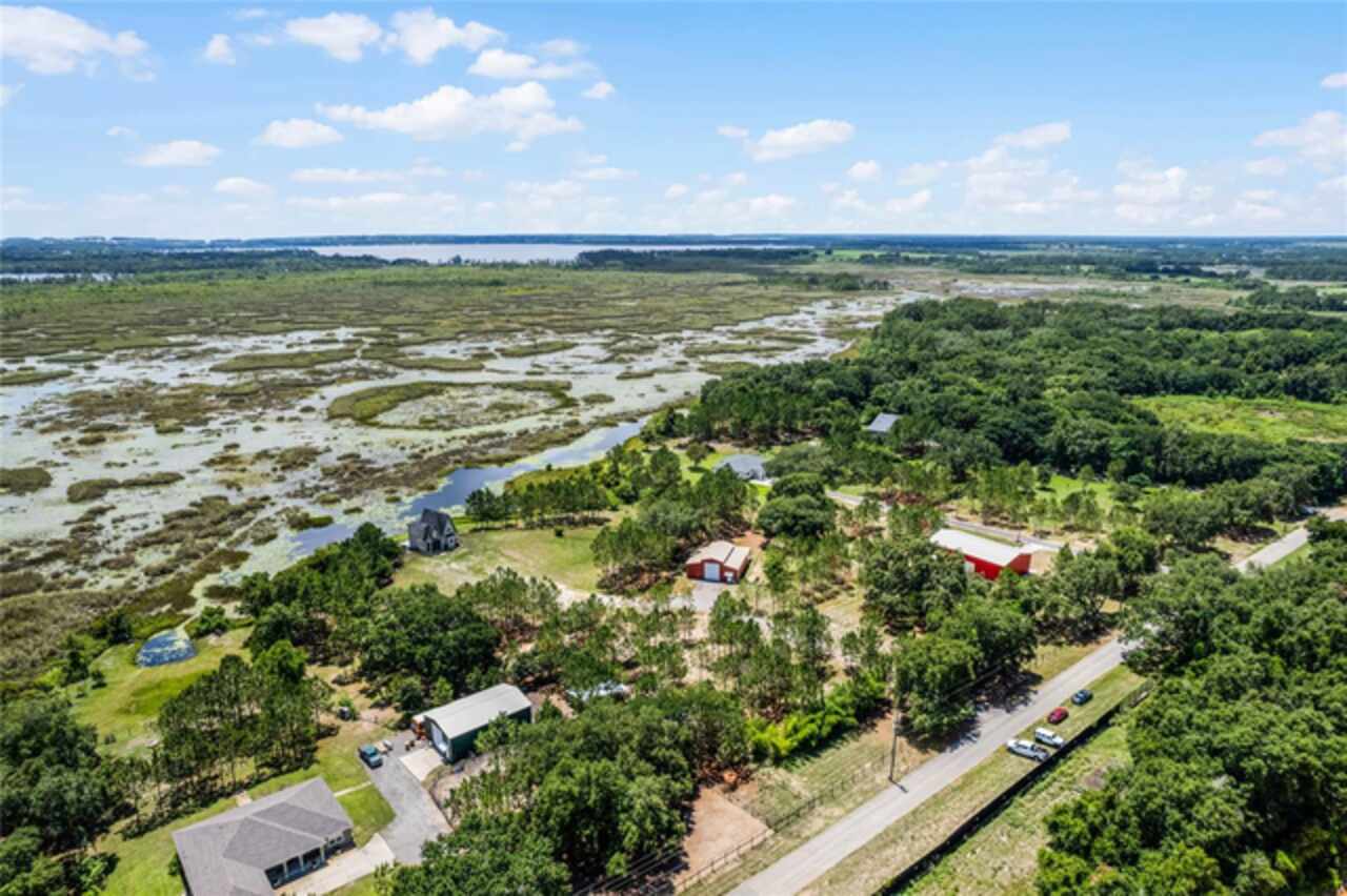 This amazing home located on 5.8 acres overlooking an expanse of waters and nature including daily sunrises peeking over the horizon. PERFECT LOCATION FOR YOUR SMALL BUSINESS, park all your vehicles, work on your equipment as there is a 14' center garage door AND 2 offices or workshops UNDER AIR. This incredible 41'x41' Carolina Barn and home are behind a motorized gate, and fenced. Need a place for gardens, greenhouses (but 3 minutes from a Publix shopping center), bring your horses and animals! The luxury chicken coop complete w/24 hens and 2 roosters and can be the start of your farm, or use this property as a home based business. Keep your equipment, large trucks and RV here! When the gate opens and leads you onto this gorgeous property, lined with huge oaks, fruit trees, bamboo for privacy, crepe myrtles, native Florida plants and other shrubs, the peaceful invitation is apparent. At the top of the hill is this gorgeous home w/incredible pitched roof lines which creates a beautiful silhouette against the blue skies, but also creates amazing architecture inside. The cathedral ceilings in the living room allow the huge (NEW) windows let in the gorgeous rays from the sunrises and enables the views out overlooking the birds in the water, the fish jumping, an occasional otter swimming by, and the incredible birds swooping around the home, and third generation sandhill cranes roosting and raising their babies. The primary suite has the highest level view out both the front and rear of the home, the bathroom was remodeled w/beautiful tile walls and stone floor in the shower. The family room on the lowest level is still at a high level looking out the back, has plenty of room for your home office area with closet storage, and the laundry space has tons of extra storage. Out onto the sunroom, you have a massive porch area - perfect for entertaining and relaxing. From your side screened porch off the living room, your front screened porch or your sun room, you can bring the outside in. From the inside, there isn't a room without a view, perfection. The workshops are second to none. Concrete slab and steel construction, the center aisle has plenty of space for vehicles, boats, RV, work equipment and tons of storage w/the lofts on both sides. The dual workshops are under AC, so these can be utilized as offices, art studios, school rooms, or other creative ventures. There is additional covered workshop and carport areas off the back of the building, also on concrete for parking/projects. The wellhouse was built with storage in mind, no need to clutter your workshop w/lawn tools, they all fit here. Located on a paved, dead end road, you can live as privately as you would like. Knowing that the home has been updated and extremely well maintained, the decision to live on acreage, wi/all the conveniences of city living within minutes is a simple one. The option of having your business run from your home is attractive with the distance of the home from the workshops will maintain that privacy. Your dream garden, sunrise or afternoon fishing from the bass filled waters, bird watching, your mini farm, your home based business (or lease out the space you don't need), your Airbnb investment, an idea undiscovered, it is all here for you. Bring your cameras, paints and easel or writer's desk. Inspiration is everywhere here, just waiting for you to discover. Incredibly underpriced now, please see the interior/drone video and make your appointment today!