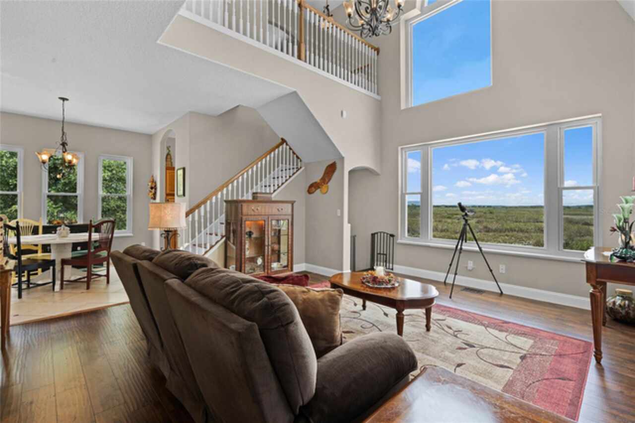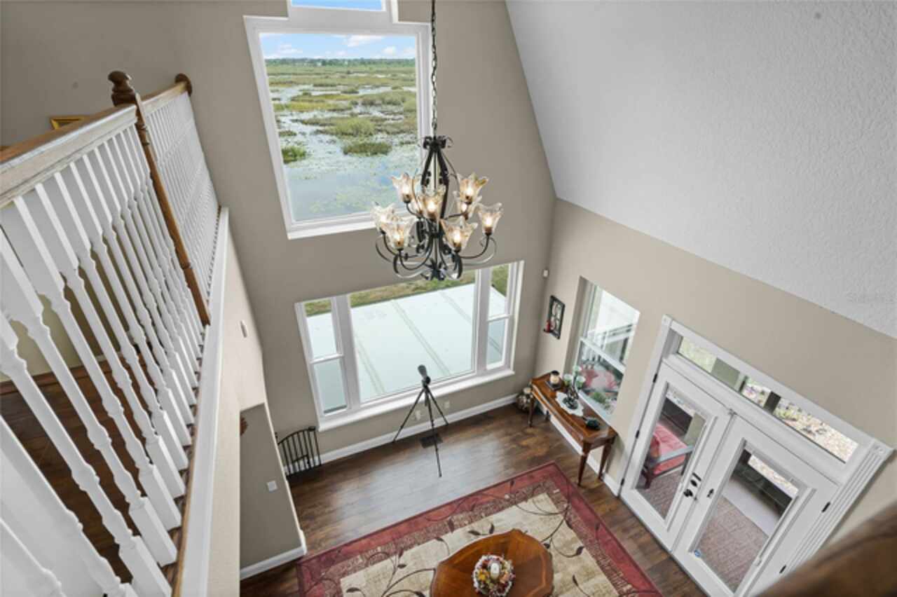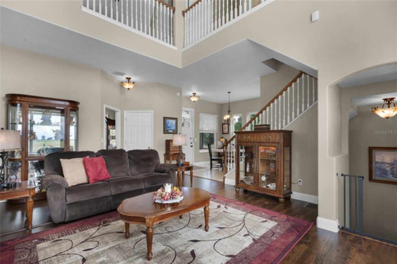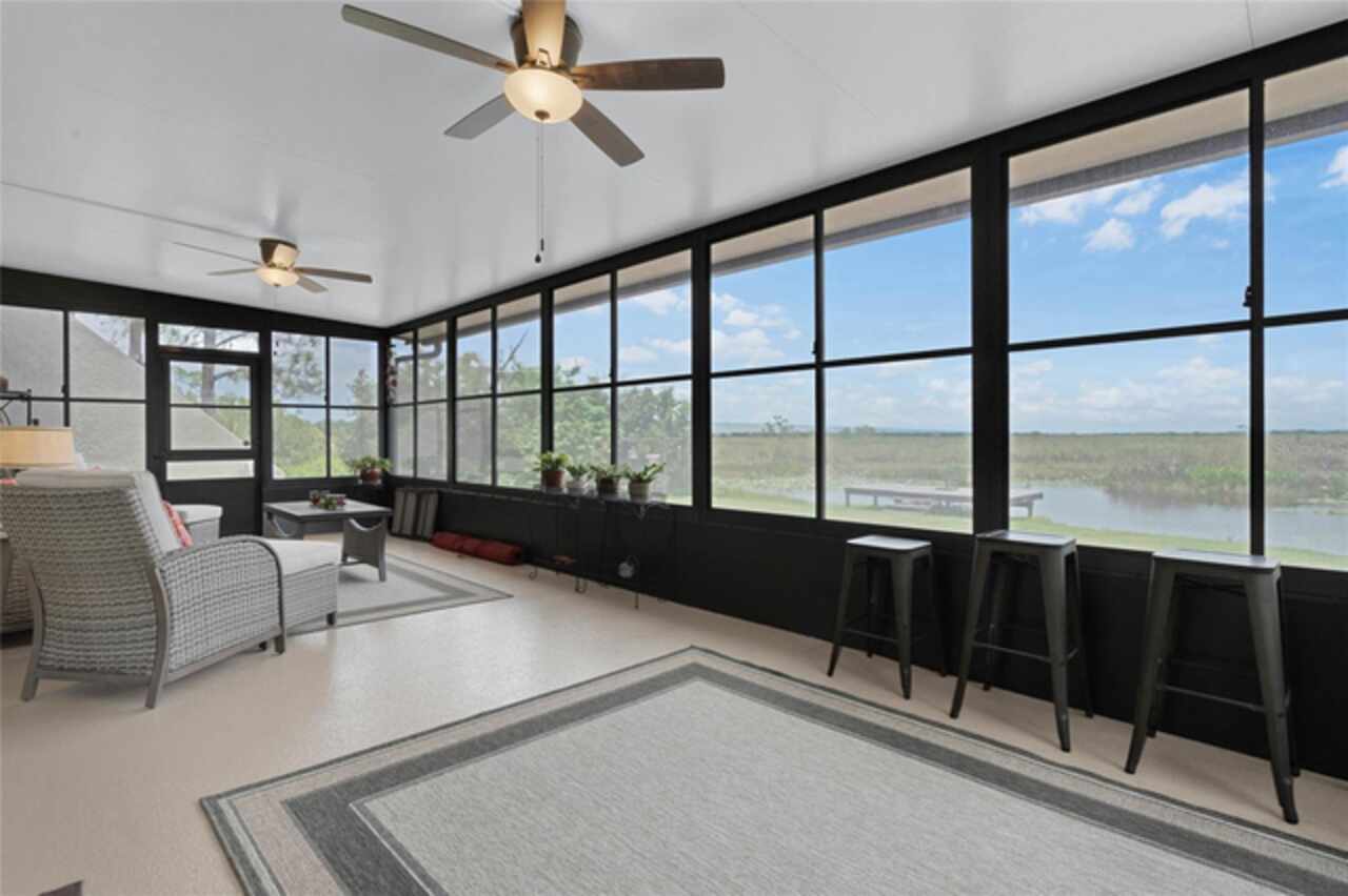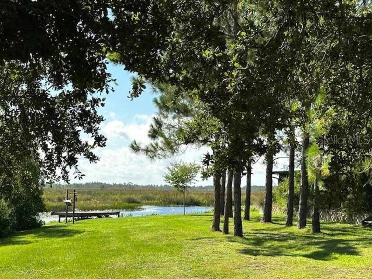 This amazing home located on 5.8 acres overlooking an expanse of waters and nature including daily sunrises peeking over the horizon. PERFECT LOCATION FOR YOUR SMALL BUSINESS, park all your vehicles, work on your equipment as there is a 14' center garage door AND 2 offices or workshops UNDER AIR. This incredible 41'x41' Carolina Barn and home are behind a motorized gate, and fenced. Need a place for gardens, greenhouses (but 3 minutes from a Publix shopping center), bring your horses and animals! The luxury chicken coop complete w/24 hens and 2 roosters and can be the start of your farm, or use this property as a home based business. Keep your equipment, large trucks and RV here! When the gate opens and leads you onto this gorgeous property, lined with huge oaks, fruit trees, bamboo for privacy, crepe myrtles, native Florida plants and other shrubs, the peaceful invitation is apparent. At the top of the hill is this gorgeous home w/incredible pitched roof lines which creates a beautiful silhouette against the blue skies, but also creates amazing architecture inside. The cathedral ceilings in the living room allow the huge (NEW) windows let in the gorgeous rays from the sunrises and enables the views out overlooking the birds in the water, the fish jumping, an occasional otter swimming by, and the incredible birds swooping around the home, and third generation sandhill cranes roosting and raising their babies. The primary suite has the highest level view out both the front and rear of the home, the bathroom was remodeled w/beautiful tile walls and stone floor in the shower. The family room on the lowest level is still at a high level looking out the back, has plenty of room for your home office area with closet storage, and the laundry space has tons of extra storage. Out onto the sunroom, you have a massive porch area - perfect for entertaining and relaxing. From your side screened porch off the living room, your front screened porch or your sun room, you can bring the outside in. From the inside, there isn't a room without a view, perfection. The workshops are second to none. Concrete slab and steel construction, the center aisle has plenty of space for vehicles, boats, RV, work equipment and tons of storage w/the lofts on both sides. The dual workshops are under AC, so these can be utilized as offices, art studios, school rooms, or other creative ventures. There is additional covered workshop and carport areas off the back of the building, also on concrete for parking/projects. The wellhouse was built with storage in mind, no need to clutter your workshop w/lawn tools, they all fit here. Located on a paved, dead end road, you can live as privately as you would like. Knowing that the home has been updated and extremely well maintained, the decision to live on acreage, wi/all the conveniences of city living within minutes is a simple one. The option of having your business run from your home is attractive with the distance of the home from the workshops will maintain that privacy. Your dream garden, sunrise or afternoon fishing from the bass filled waters, bird watching, your mini farm, your home based business (or lease out the space you don't need), your Airbnb investment, an idea undiscovered, it is all here for you. Bring your cameras, paints and easel or writer's desk. Inspiration is everywhere here, just waiting for you to discover. Incredibly underpriced now, please see the interior/drone video and make your appointment today!
