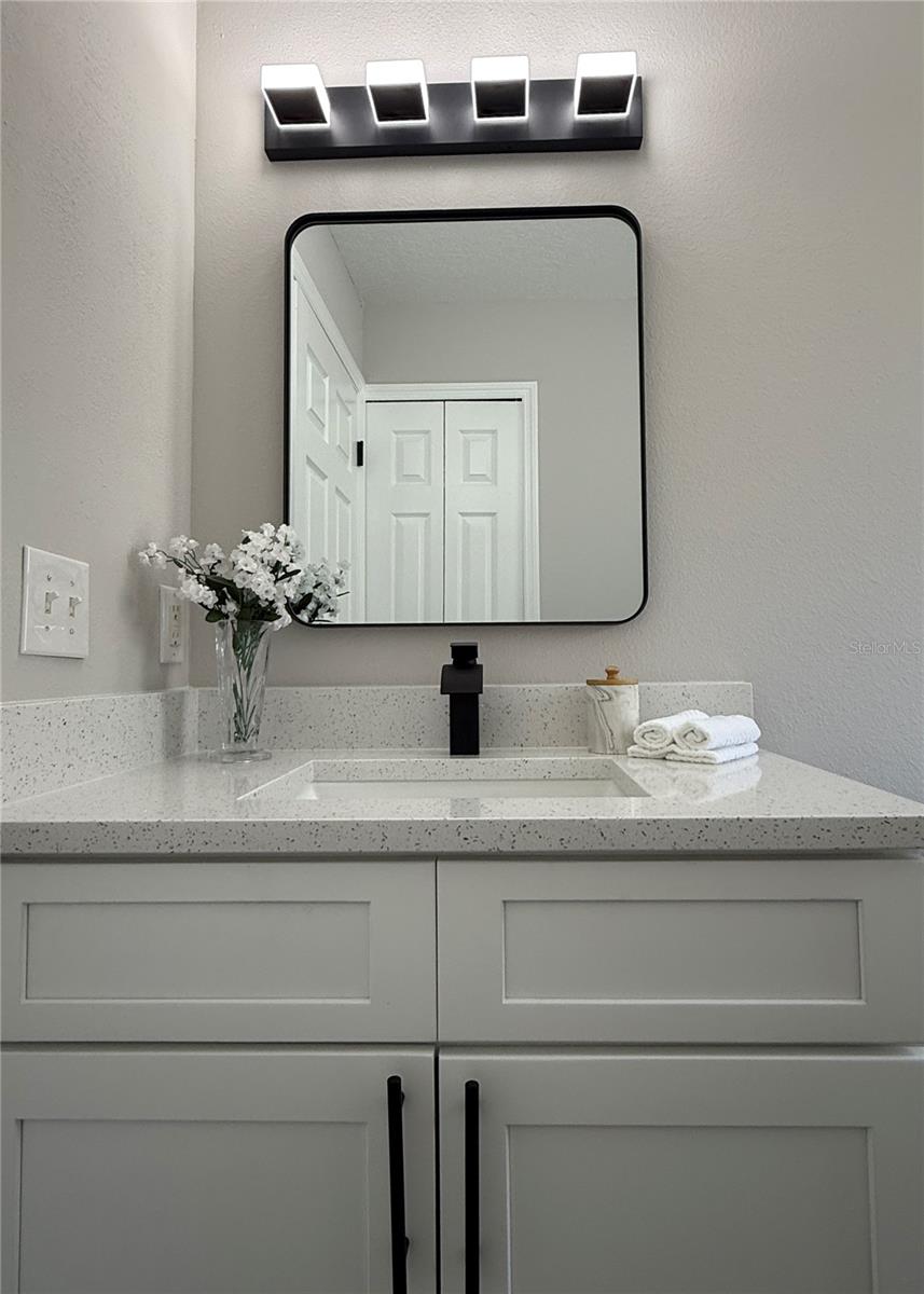 Welcome to this beautifully remodeled 3-bedroom, 2-bath home in a prime location near world-famous theme parks, shopping, and restaurants! This home offers a modern open floor plan with a split bedroom design, perfect for comfort and privacy. Step inside to find new wood-look tile flooring throughout, new baseboards, and fresh interior paint. Both bathrooms have been tastefully updated with polished porcelain tile, new vanities, and stylish modern fixtures. The kitchen is a true showstopper with brand new 36" soft-closing shaker cabinets, quartz countertops, matte black hardware, and a Samsung stainless steel appliance package. Ceiling fans in all rooms add extra comfort. Enjoy peace of mind with a brand new heat pump AC system and a newer roof. This move-in ready home blends style, function, and convenience—perfect for your next chapter!
