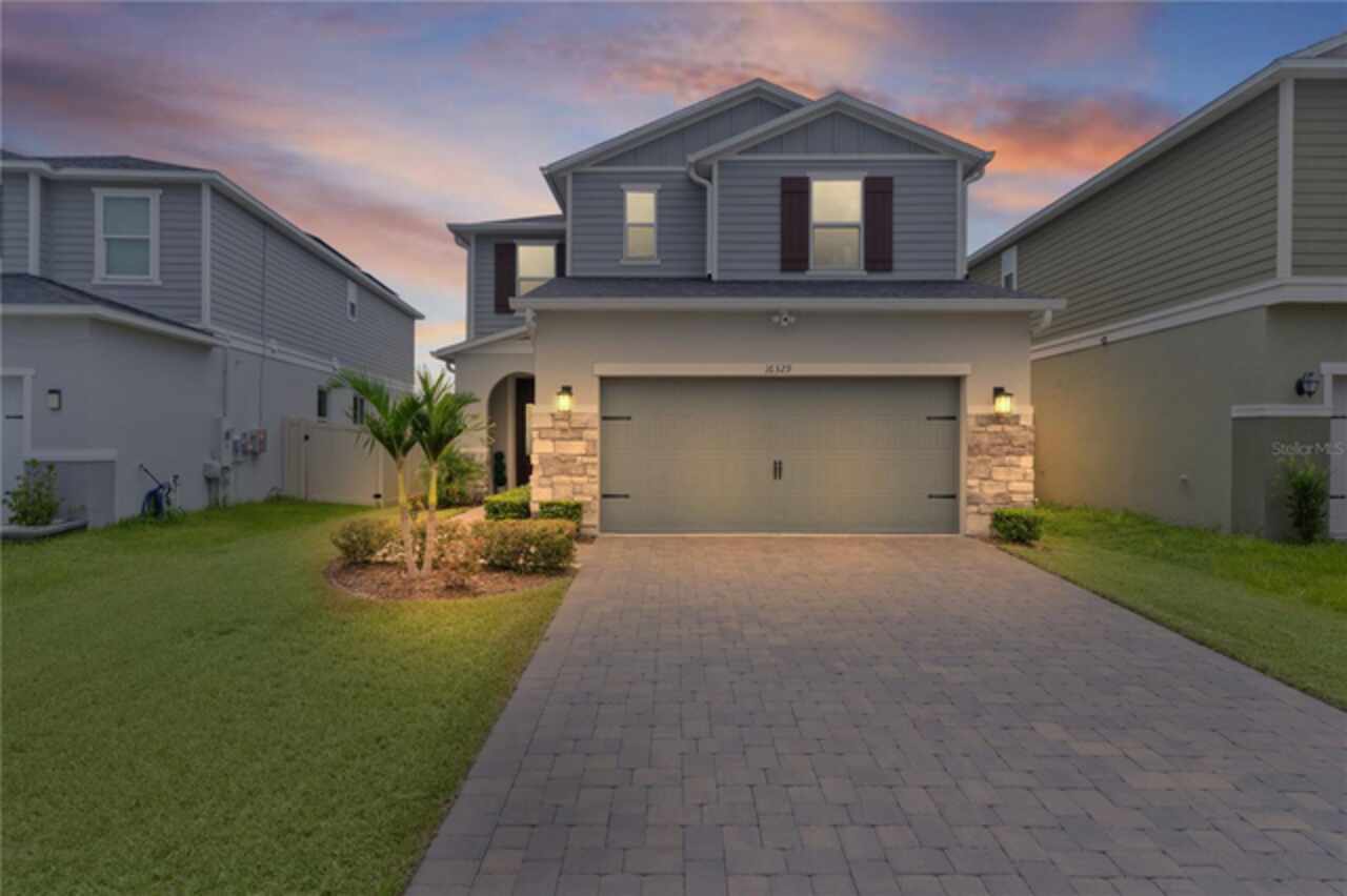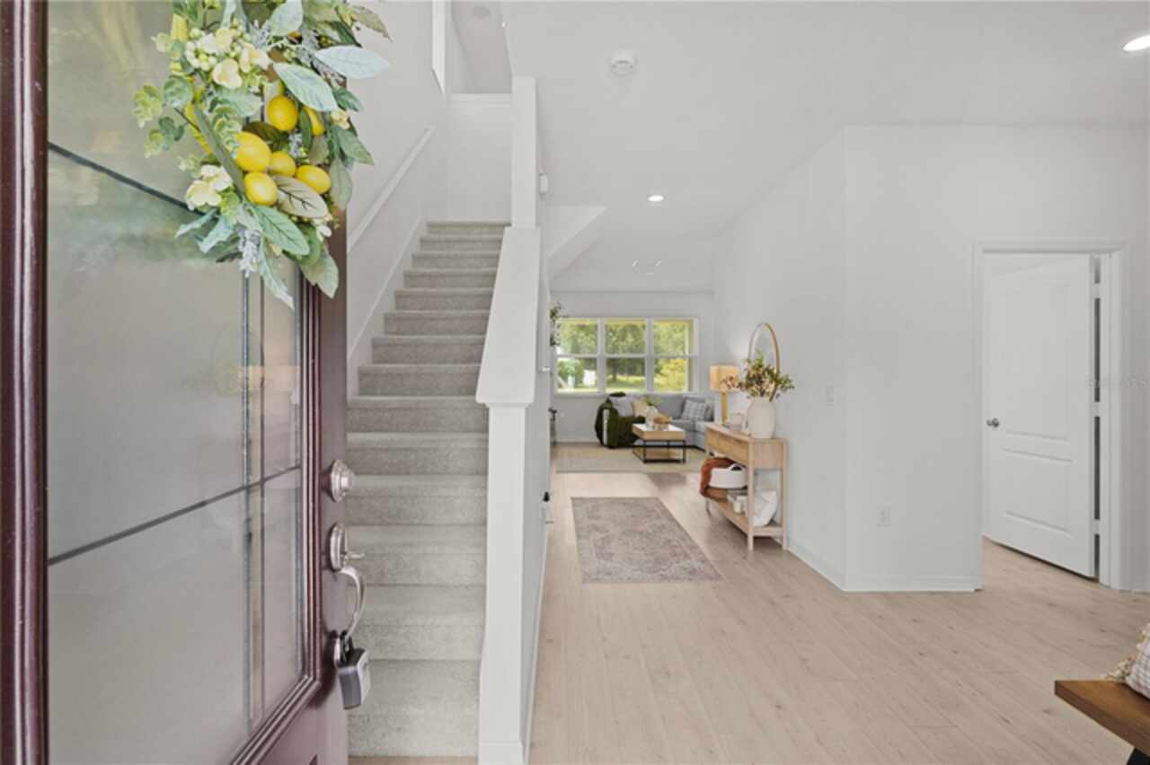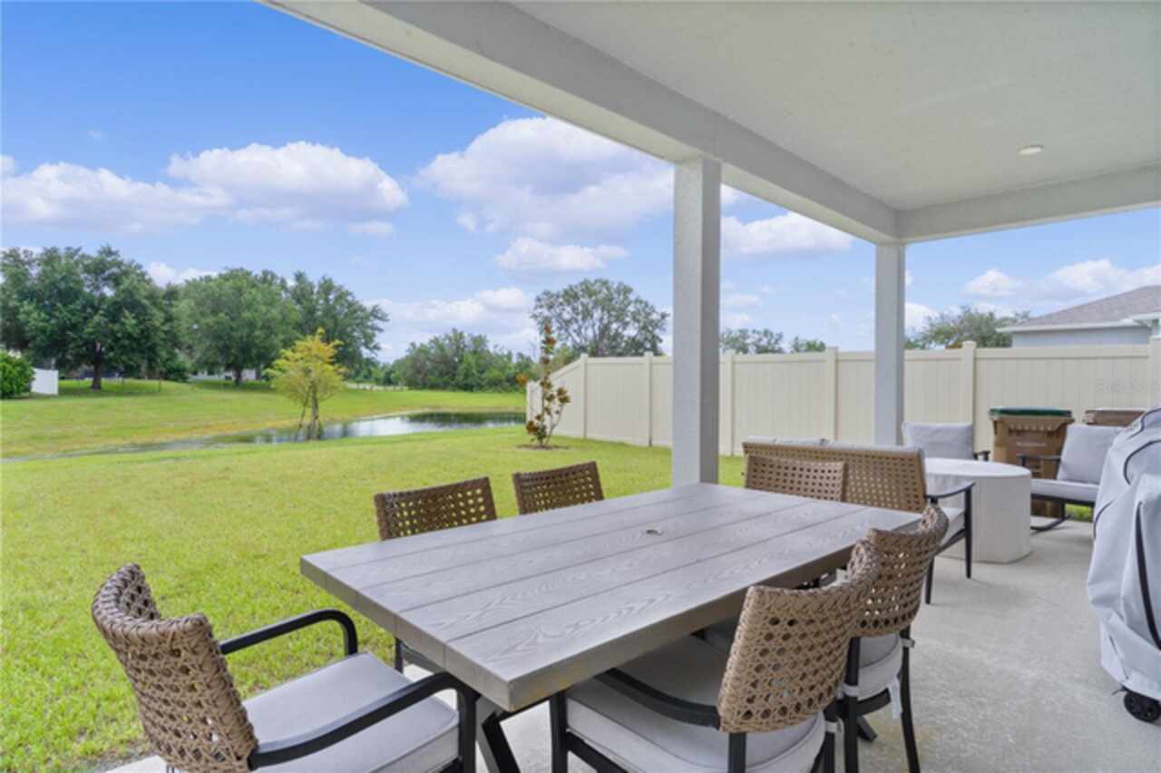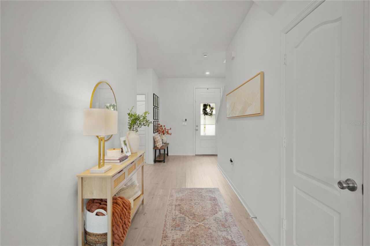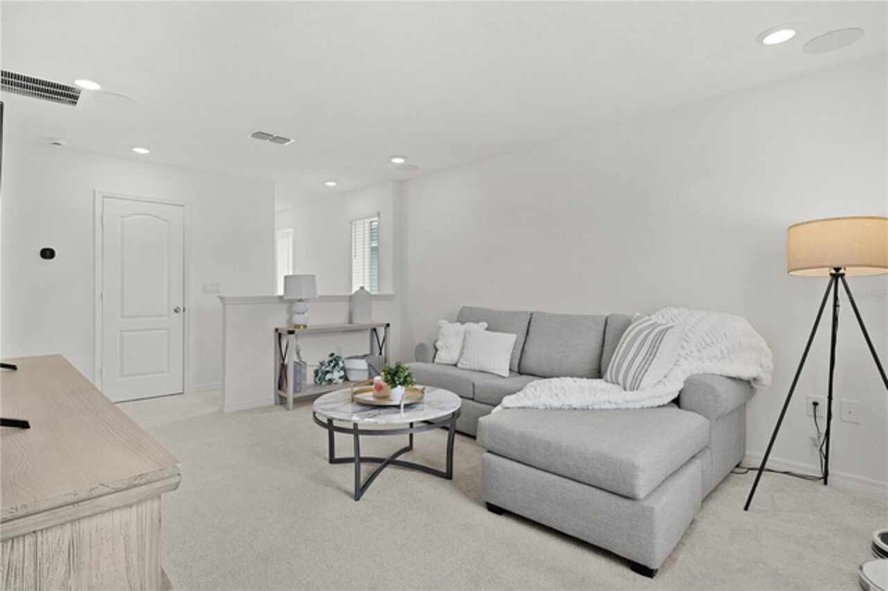 Welcome to your Sanctuary! This beautifully maintained 2-year old home is practically brand new! The home features 3 bedrooms, 2.5 baths, a bonus den that can easily serve as a 4th bedroom, and an upstairs loft. Enjoy the high ceilings, quartz countertops in the kitchen and bathrooms, luxury vinyl plank flooring downstairs, and a host of modern upgrades throughout - including smart home features. Relax on the large covered lanai with peaceful pond views and no direct rear neighbors. Located minutes from schools and Disney World, this home offers comfort, privacy, and convenience for your family! Don't miss out, schedule your tour today!