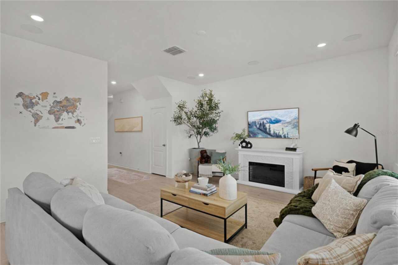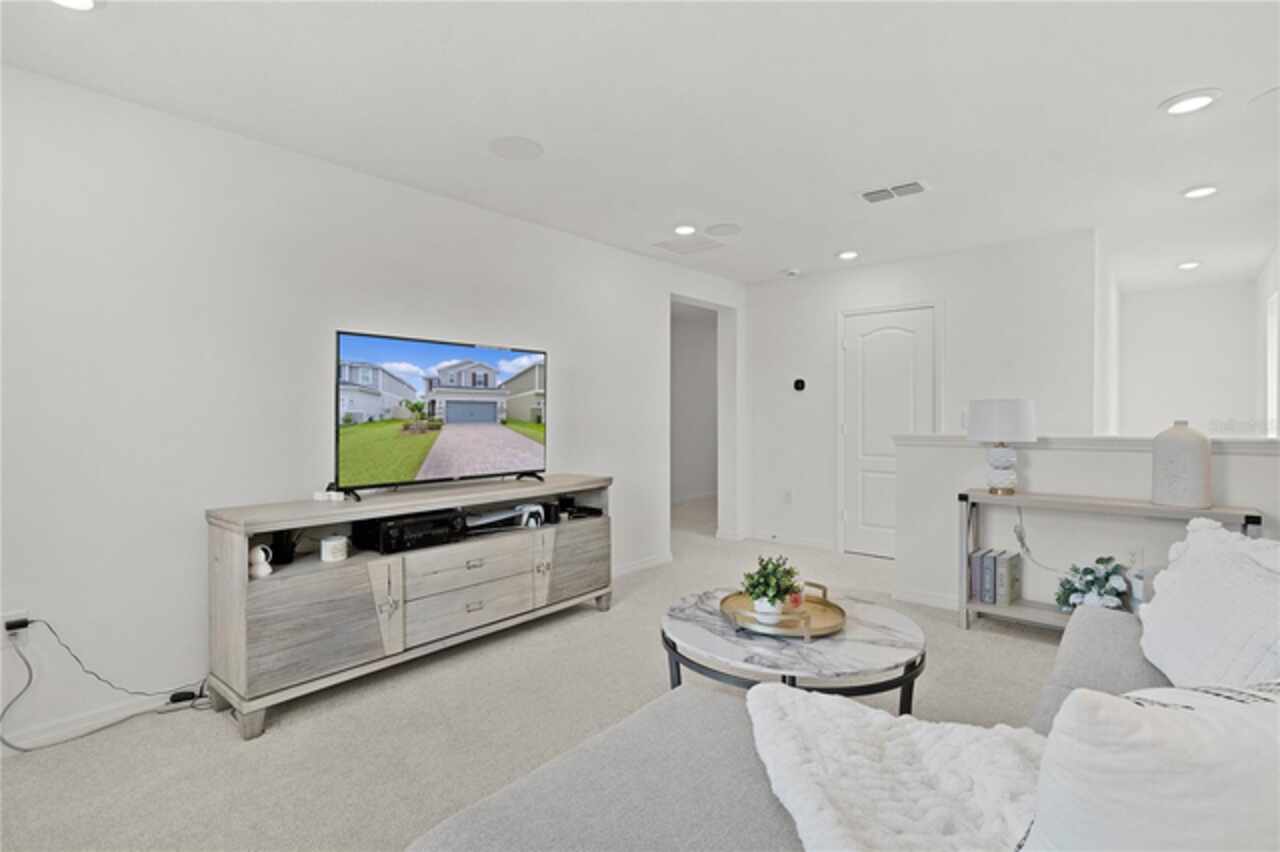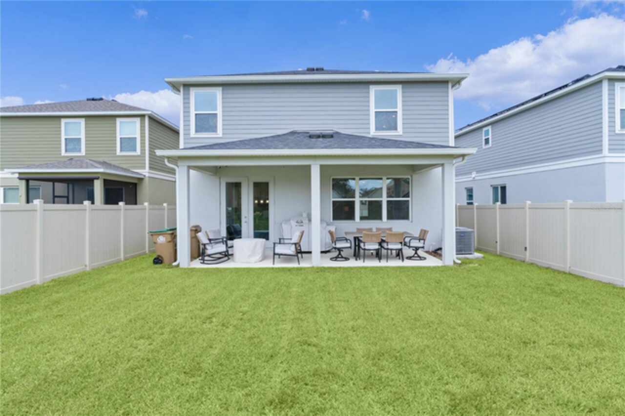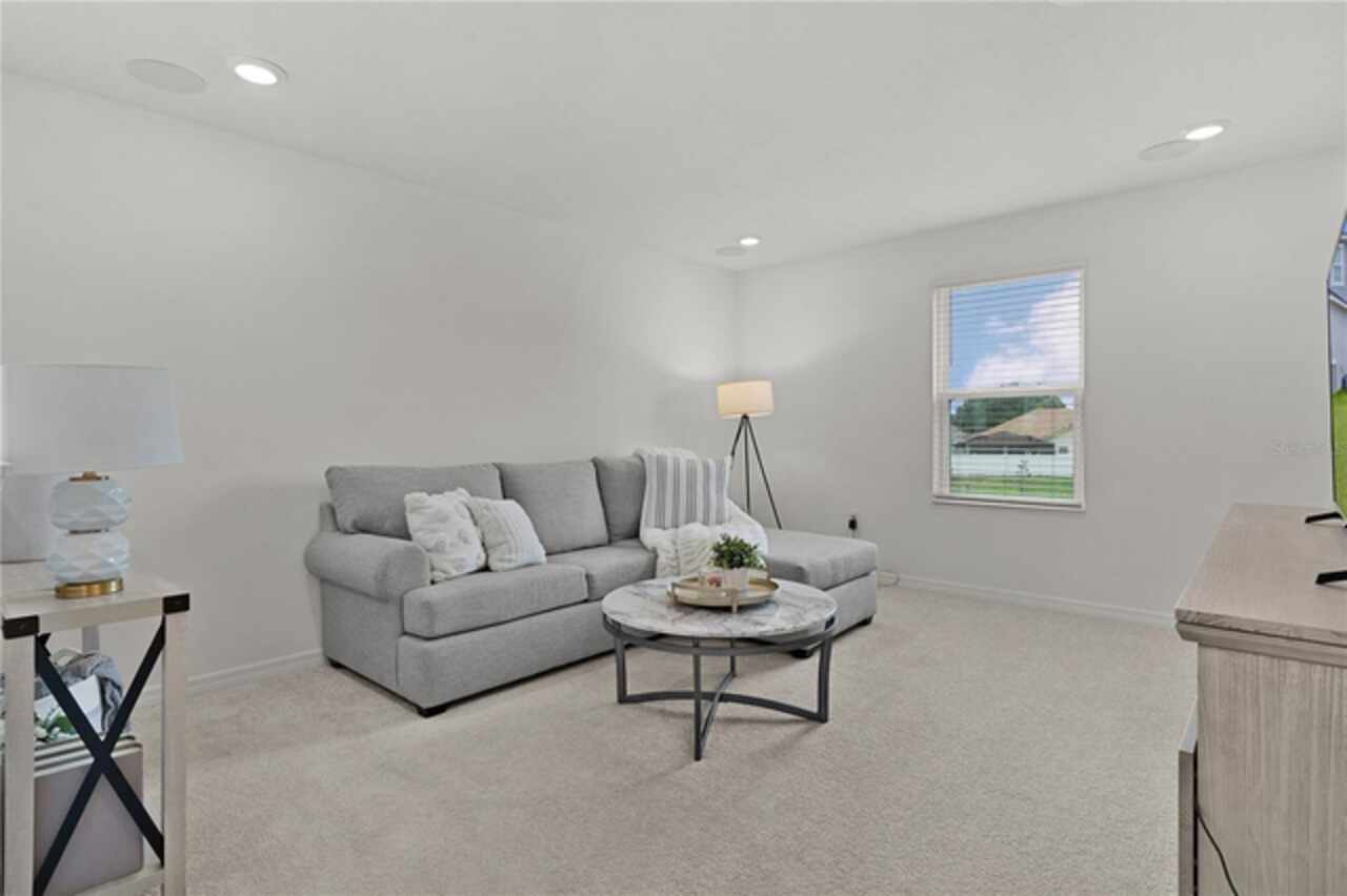 Welcome to your Sanctuary! This beautifully maintained 2-year old home is practically brand new! The home features 3 bedrooms, 2.5 baths, a bonus den that can easily serve as a 4th bedroom, and an upstairs loft. Enjoy the high ceilings, quartz countertops in the kitchen and bathrooms, luxury vinyl plank flooring downstairs, and a host of modern upgrades throughout - including smart home features. Relax on the large covered lanai with peaceful pond views and no direct rear neighbors. Located minutes from schools and Disney World, this home offers comfort, privacy, and convenience for your family! Don't miss out, schedule your tour today!