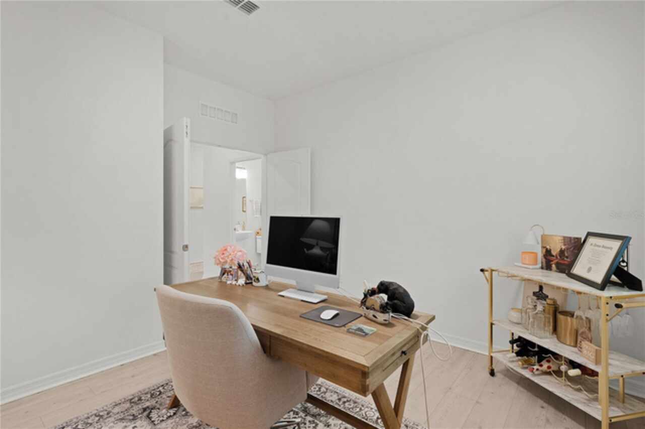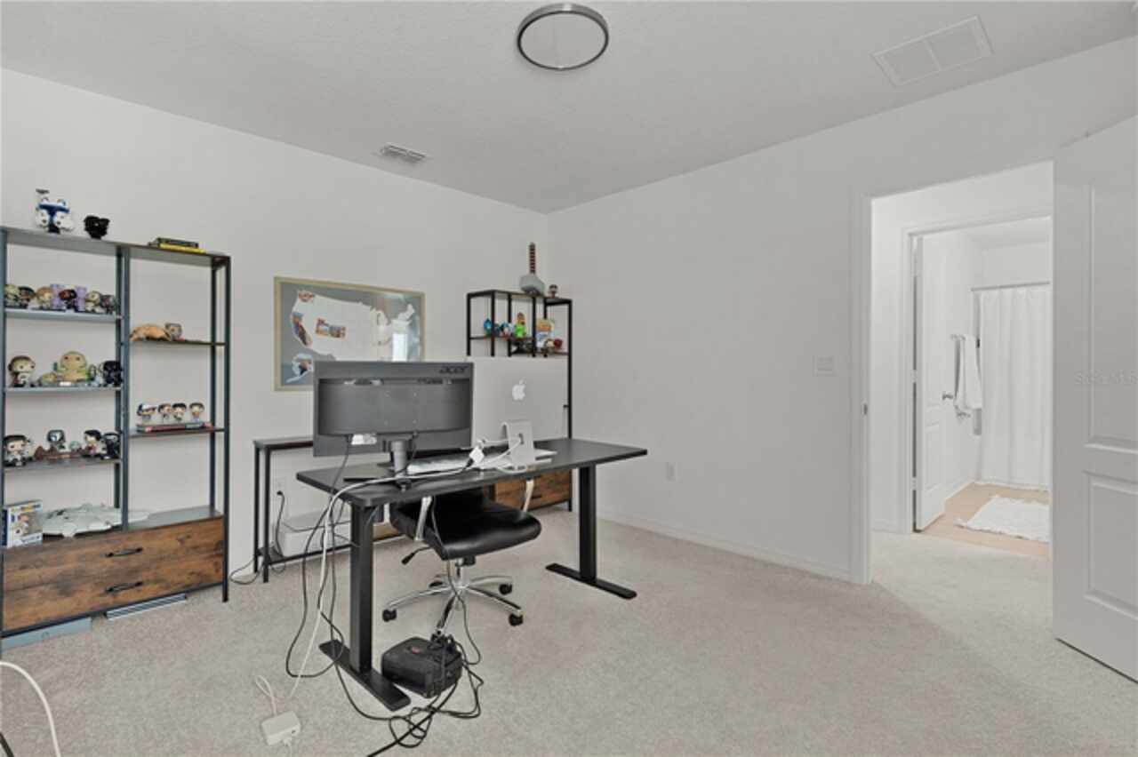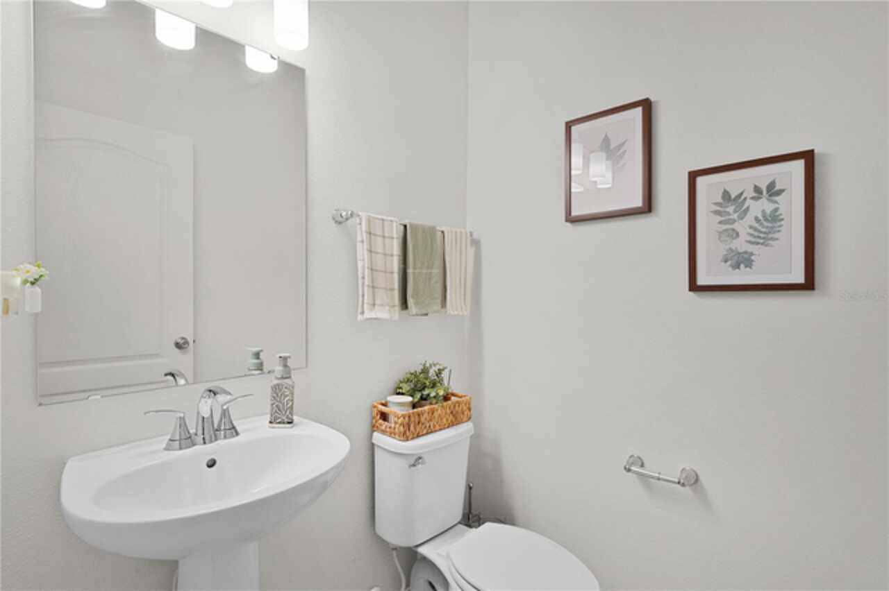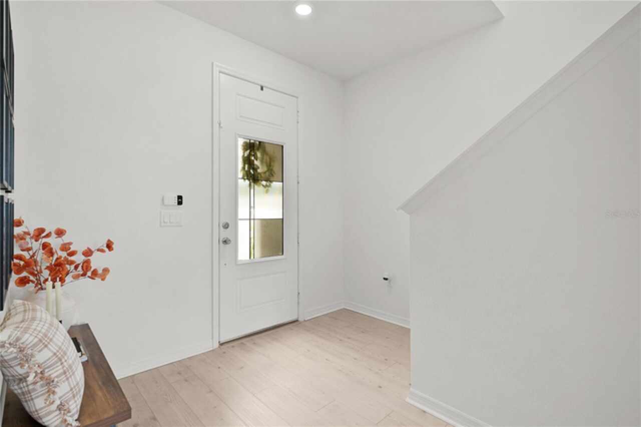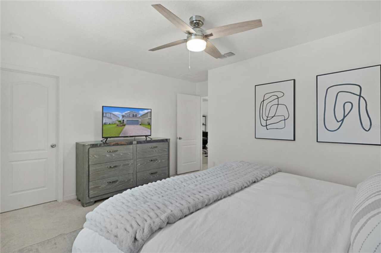 Welcome to your Sanctuary! This beautifully maintained 2-year old home is practically brand new! The home features 3 bedrooms, 2.5 baths, a bonus den that can easily serve as a 4th bedroom, and an upstairs loft. Enjoy the high ceilings, quartz countertops in the kitchen and bathrooms, luxury vinyl plank flooring downstairs, and a host of modern upgrades throughout - including smart home features. Relax on the large covered lanai with peaceful pond views and no direct rear neighbors. Located minutes from schools and Disney World, this home offers comfort, privacy, and convenience for your family! Don't miss out, schedule your tour today!