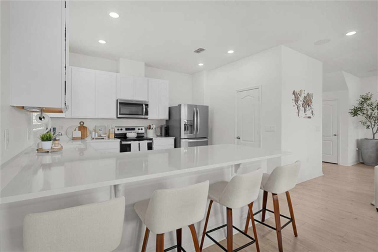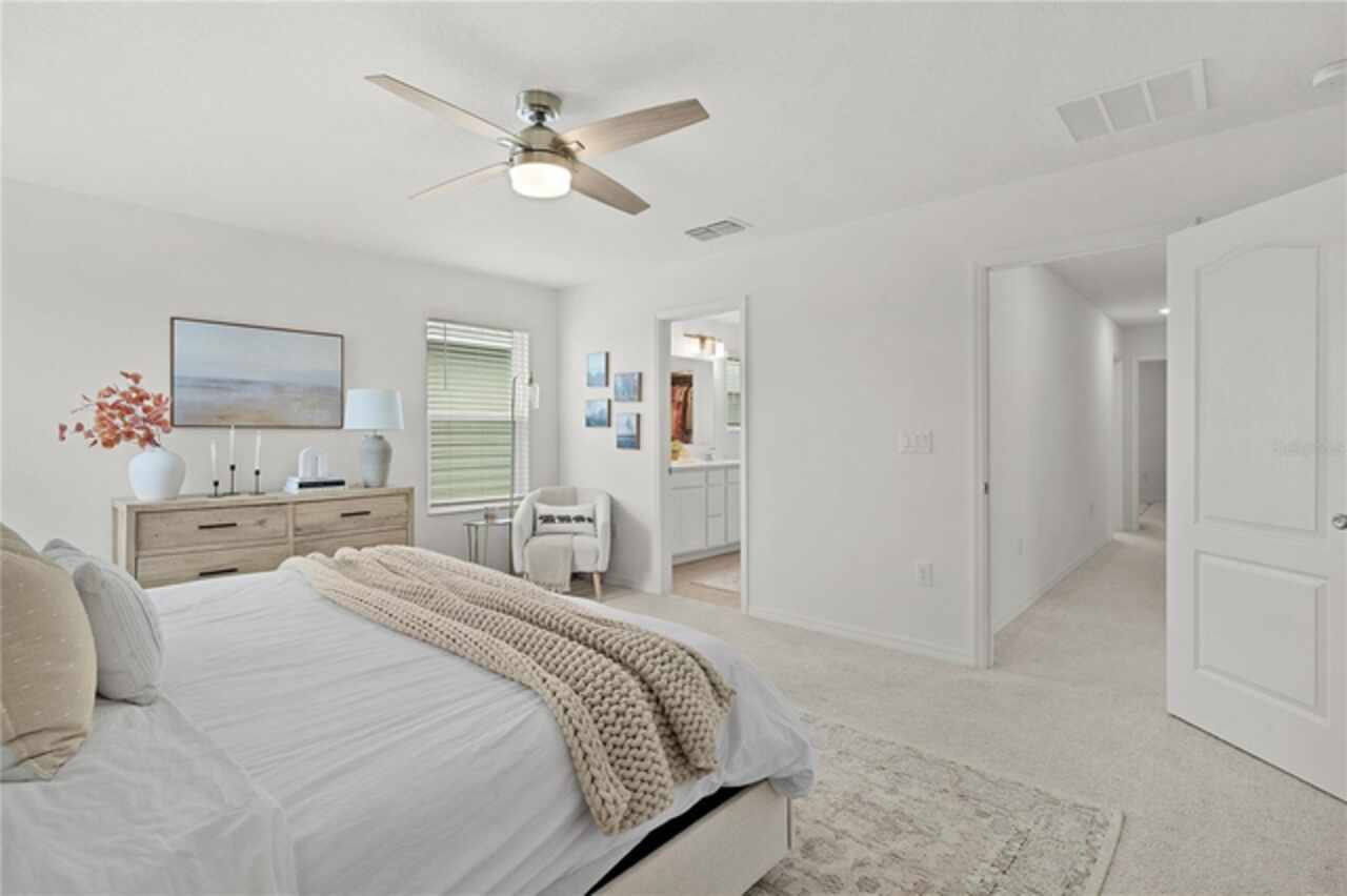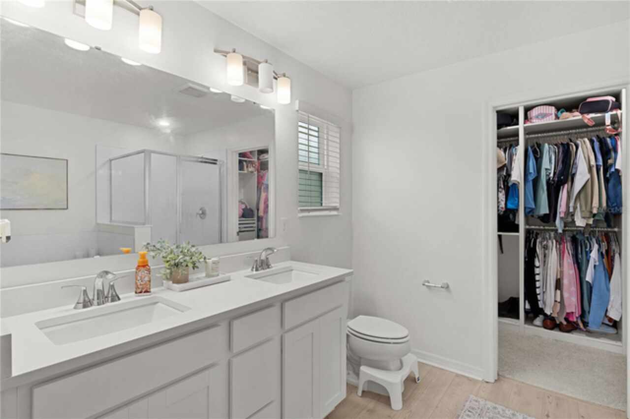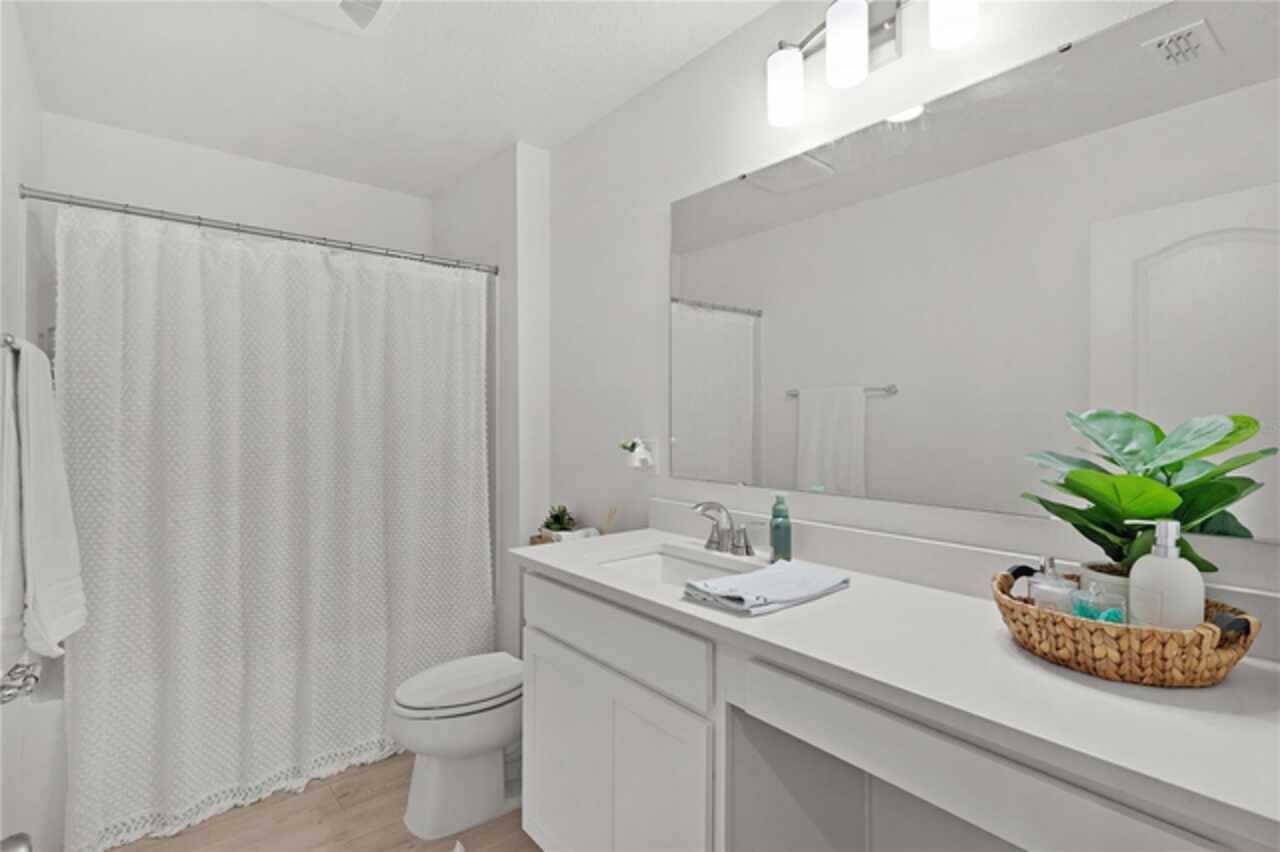 Welcome to your Sanctuary! This beautifully maintained 2-year old home is practically brand new! The home features 3 bedrooms, 2.5 baths, a bonus den that can easily serve as a 4th bedroom, and an upstairs loft. Enjoy the high ceilings, quartz countertops in the kitchen and bathrooms, luxury vinyl plank flooring downstairs, and a host of modern upgrades throughout - including smart home features. Relax on the large covered lanai with peaceful pond views and no direct rear neighbors. Located minutes from schools and Disney World, this home offers comfort, privacy, and convenience for your family! Don't miss out, schedule your tour today!
