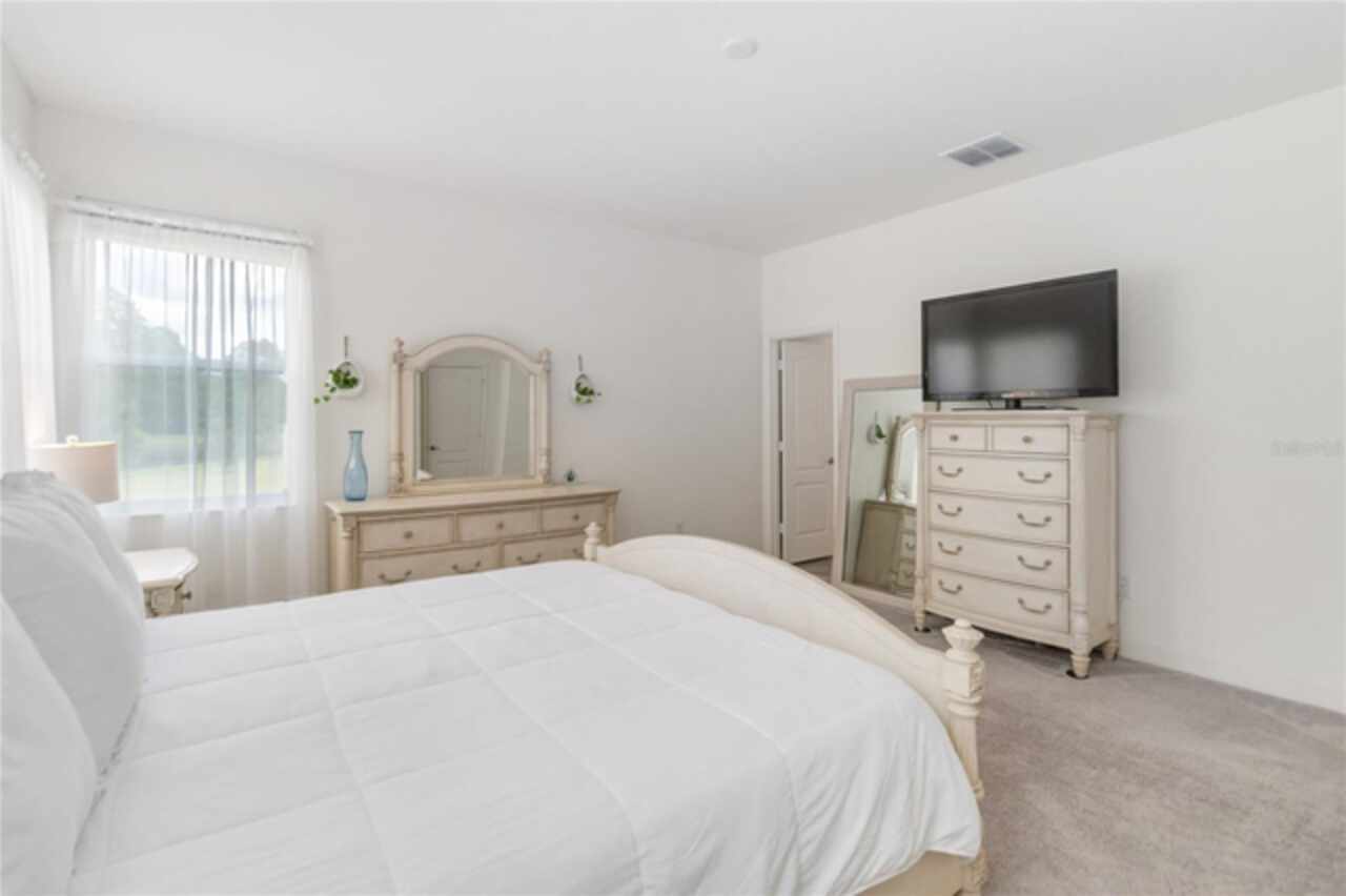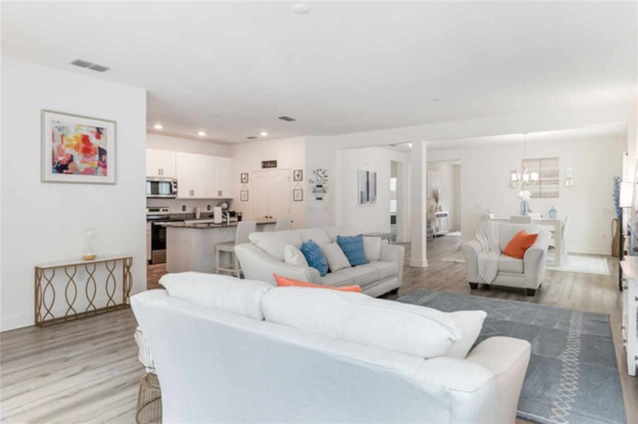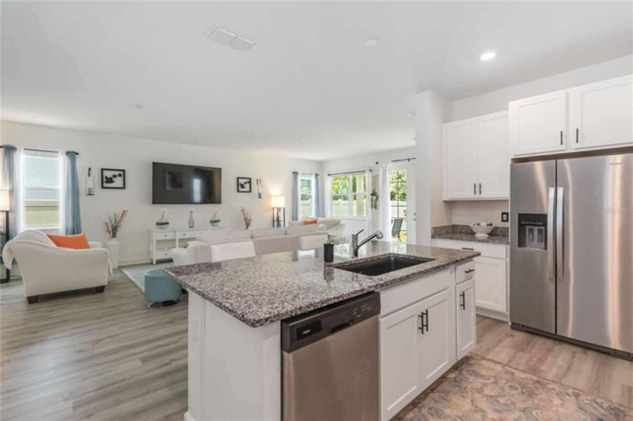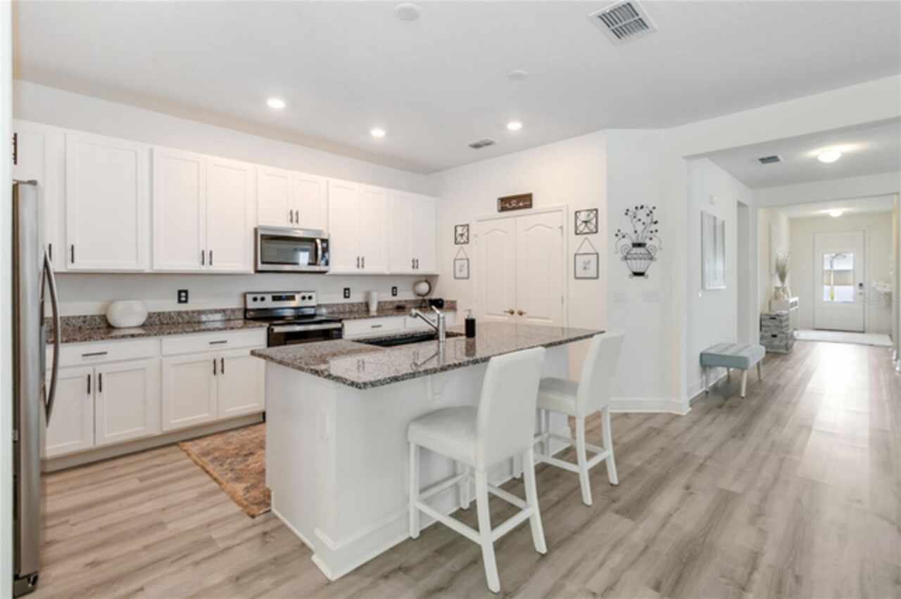 Welcome to this stunning ranch-style home nestled in the highly desirable community of "The Sanctuary." Offering the perfect blend of modern construction and thoughtful upgrades, this immaculate 2022-built property delivers all the benefits of new without the wait—and features a brand-new roof installed in 2024 for added peace of mind and long-term value. Boasting 4 spacious bedrooms and 3 modern bathrooms, this home is designed for comfort, style, and functionality. The expansive open floor plan features soaring 9-foot ceilings with new recessed lights recently installed and elegant vinyl flooring that enhances the overall sense of space and light. The beautifully appointed kitchen offers ample cabinet storage, sleek granite countertops, stainless steel appliances, and a large center island ideal with new pendant lights recently installed for meal prep and casual dining. The luxurious primary suite is a true retreat, complete with an opulent ensuite bathroom featuring dual vanities, a walk-in shower, a garden tub, and an oversized walk-in closet. The additional bedrooms are generously sized, offering comfort and privacy for the entire family, while the guest bedroom includes its own attached bathroom for added convenience. Step outside through French doors to a covered lanai and take in tranquil views of the serene pond and lush greenbelt, with no rear neighbors ensuring maximum privacy and relaxation. The Sanctuary community is nearly complete with outstanding amenities such as a state-of-the-art fitness center, a resort-style pool, a tot lot, and a spacious dog park—everything you need for an active and vibrant lifestyle. Located in the southern part of Clermont, this property offers close proximity to shopping, dining, medical facilities, and major attractions—including Walt Disney World, Universal Studios, the Turnpike, and I-4. Both Florida coasts are just 90 minutes away, making beach getaways easily accessible. Don’t miss your opportunity to own this exceptional home with a new 2024 roof, serene views, and resort-style living—all in one of Clermont’s premier neighborhoods!