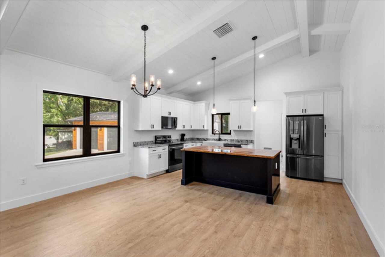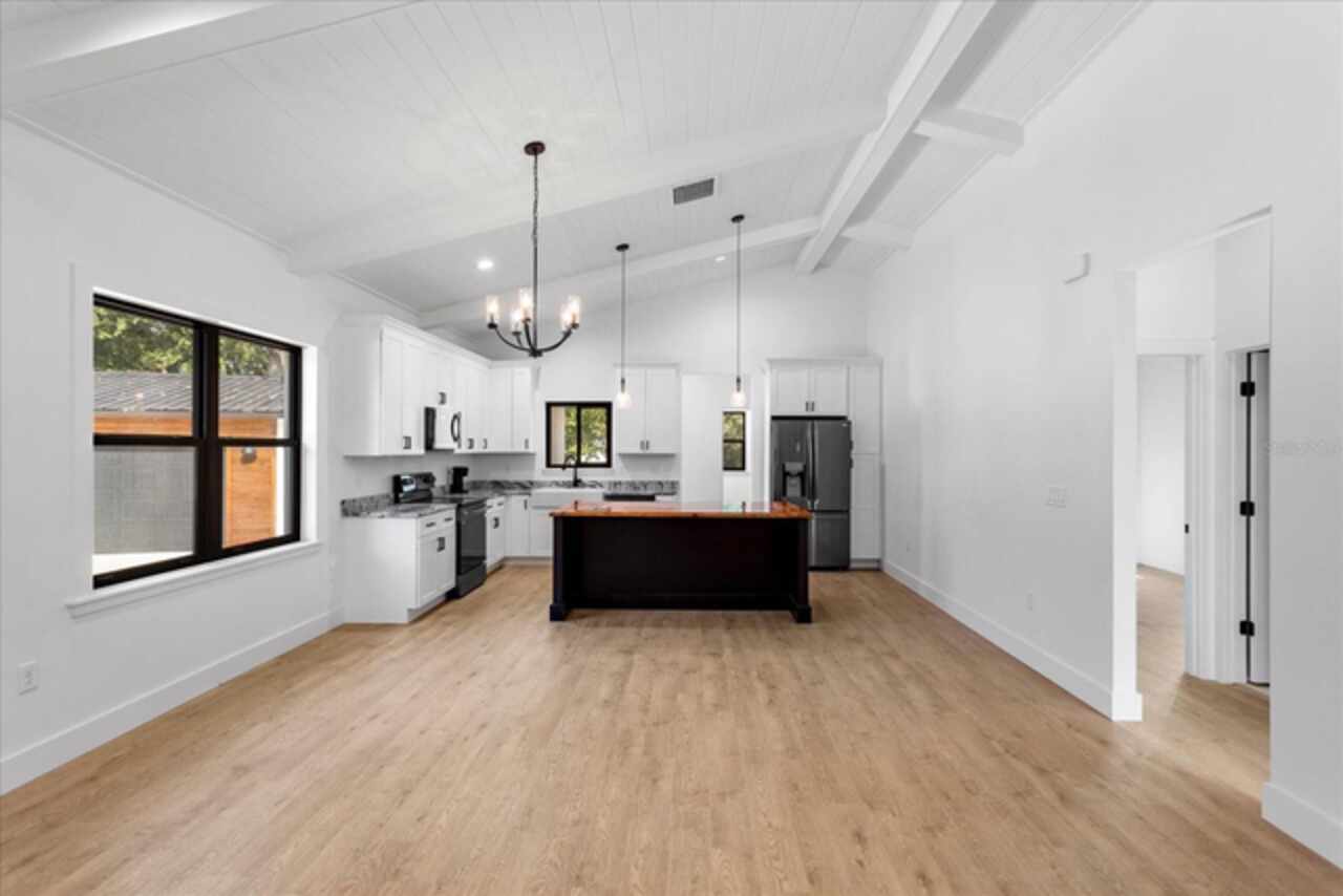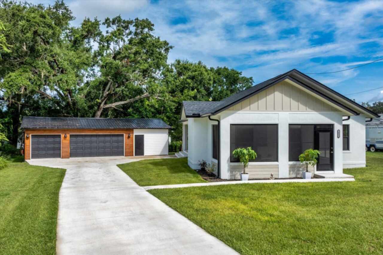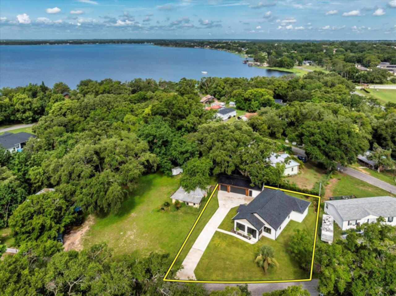 One or more photo(s) has been virtually staged. Brand New 3/2 Custom Built Home with Detached 3+ Oversized Garage/Workshop, both Built in 2024! Location, location, Close to Lake Minneola-Chain of Lakes in an Unincorporated NO HOA Neighborhood, close to US Hwy 27 & Hwy 50. Seller was planning to build another home on the lot next door, though has made other plans. Home is approx. 1, 554 sq. ft, plus 3+ Garage/ with oversized Workshop area - approx. 840 sq ft., with room for Office, Gym or Man Cave!! Additional sq ft. with screened enclosed-covered Front Porch & covered open roof large Lanai in the back of home. Builder spared no expense with up open floor plan, custom wood kitchen island, custom wood cabinets with easy open drawers, farmhouse porcelain kitchen sink with window at sink overlooking back yard, with custom natural wood wall panel inset in living room/fireplace area., vinyl wood tone finish accent wall in bathrooms, split bedroom floor plan, 2 bedrooms and guest bath between at the front of the home and the primary bedroom is tucked toward the back of the home for privacy. Many Upgraded Products with a nice floor plan in this New Single Family Home with Stainless Kitchen Appliances & Neutral Finishes throughout the home makes this home easy to move in and start unpacking right away. Open Floor plan includes a stunning vaulted ceiling with beams throughout creates an airy openness, spacious and modern elegance. Enjoy coffee or tea in the screen enclosed, under roof front porch and relax in the back yard on the lanai in the evenings. Perfect for a home business or AirBNB Investor. Great location in Clermont, near Minneola and Lake Minneola. Close to Waterfront Park Boat Launch. Could make a great forever home. Room for gardening. Home is Move-in Ready, with a deep driveway, room for multiple cars and room for an RV. Plenty of storage for Motorcycles, Mountain Bikes & Toys. Must see! This home can be purchased separately or combined with 2 adjoining vacant lots with a 1/1 SF Teardown and 1 Garage Teardown on the 3rd Parcel!