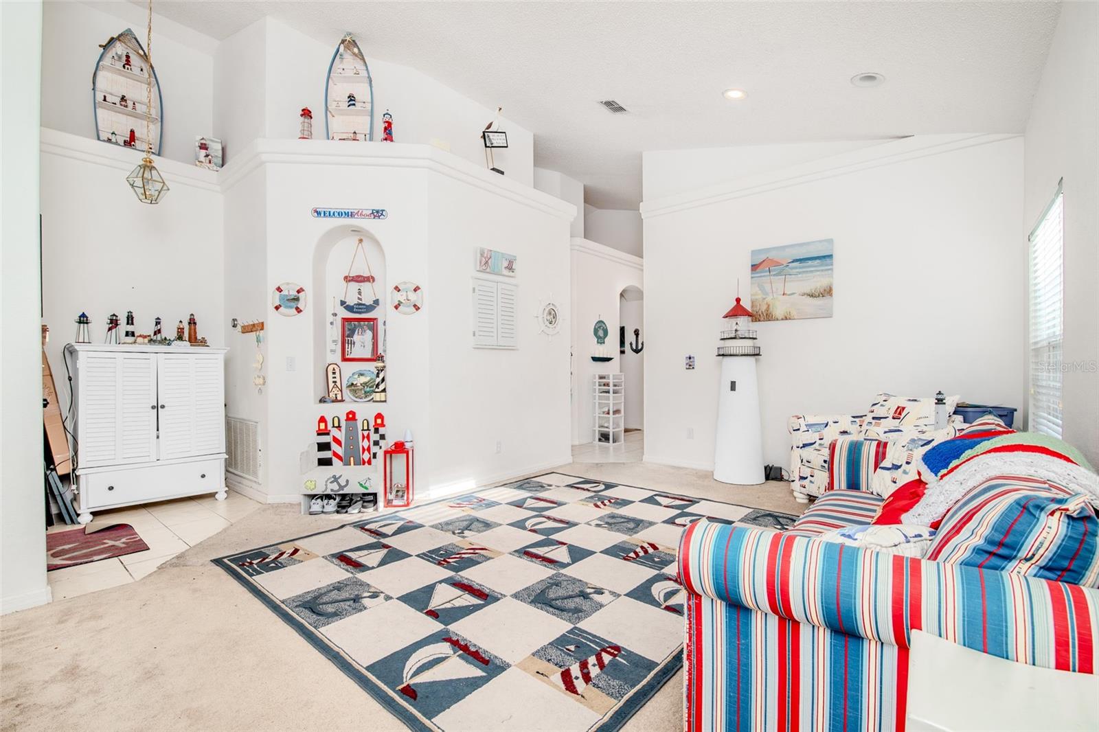 Cathedral Ceiling(s), Ceiling Fans(s), Crown Molding, High Ceilings, Kitchen/Family Room Combo, Primary Bedroom Main Floor
