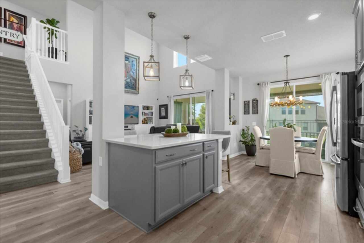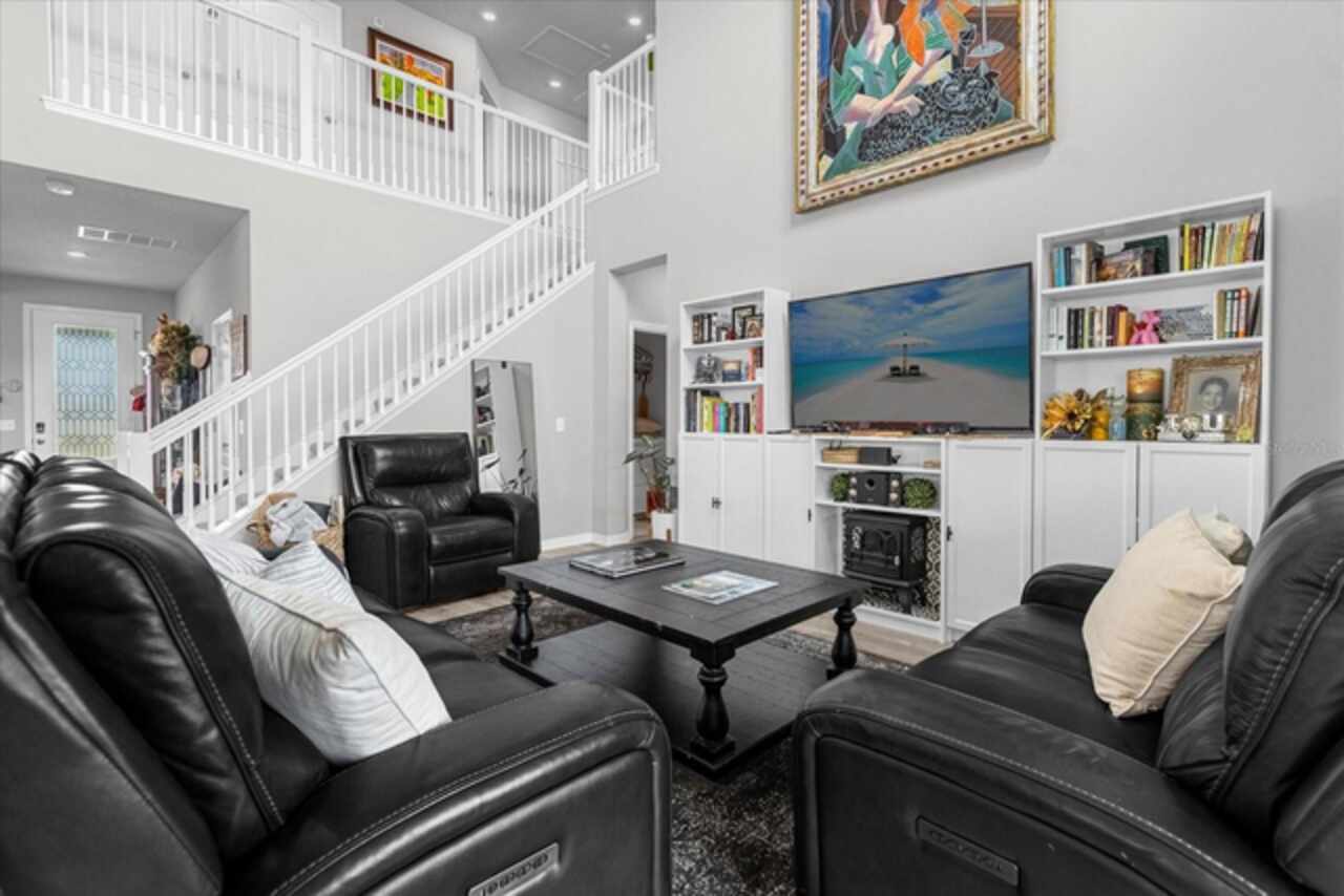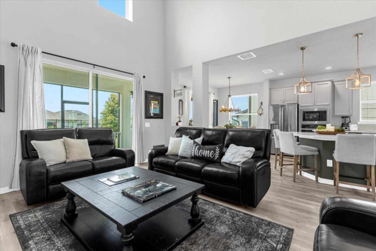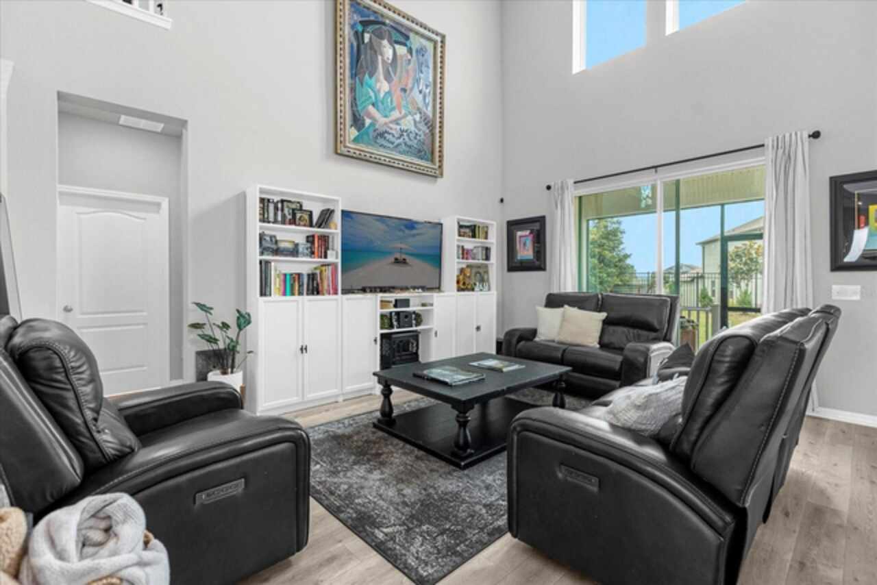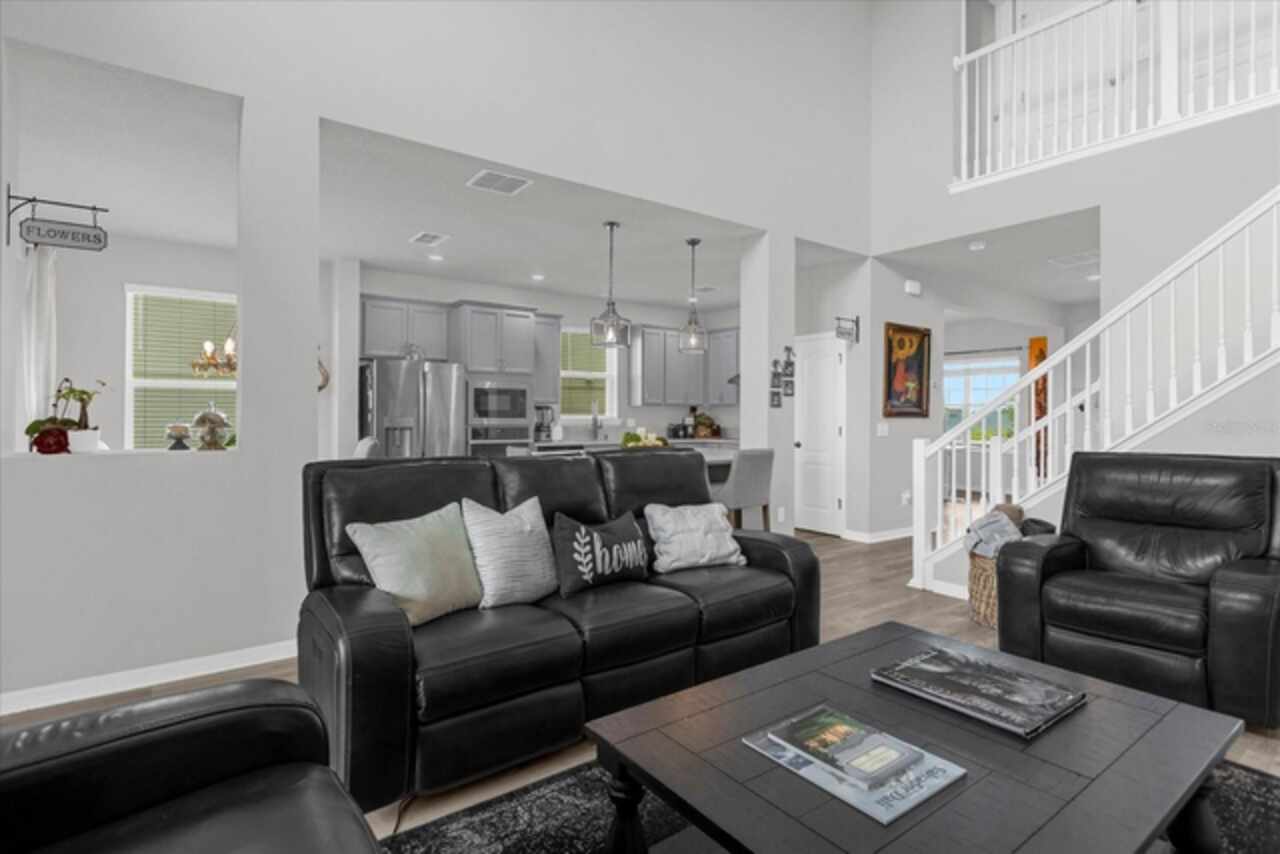 Welcome to your dream home! This spacious 4-bedroom, 3-bathroom residence offers over 2, 424 square feet of thoughtfully designed living space. Soaring high ceilings create an open and airy feel, while large windows invite natural light and slight views of the nearby lake. Enjoy Florida living at its finest with both front porch and a screened lanai, perfect for relaxing or entertaining. The fenced backyard provides privacy and room for outdoor fun, pets, or gardening. Inside, a versatile loft space offers endless possibilities—ideal as a home office, media room, or can easily be converted into a 5th bedroom. The home also features a 2-car garage, ample storage, and a smart layout that provides comfort and functionality for modern living. Located in John Lake Landing with convenient access to parks, shopping, and schools, this home blends charm, space, and flexibility. Also, there is a bedroom on the first floor and one bathroom with shower is located on the first floor. Don't miss the opportunity to make this beautiful home your own!