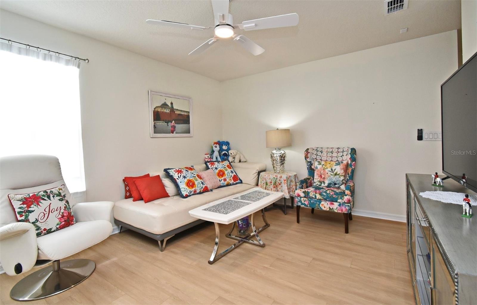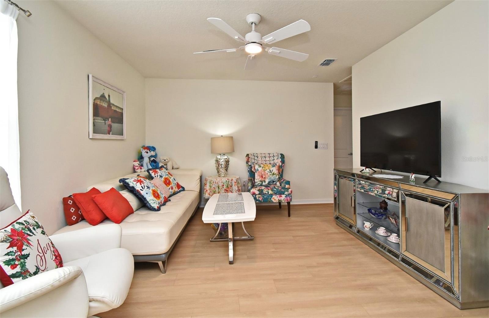 Welcome home! This stylish two-story residence offers modern amenities, a functional layout, and a spacious backyard with serene conservation views. Inside, an open-concept design seamlessly connects the living room and kitchen—ideal for entertaining or family gatherings. The kitchen features quartz countertops, a large island, stainless steel appliances, abundant cabinet space, and a pantry for extra storage. Step outside to the covered lanai, where indoor and outdoor living blend effortlessly. The first floor also includes a full bedroom and bathroom, ideal for guests, a home office, or formal dining space. Upstairs, a versatile loft provides the perfect spot for a playroom, office, or media area. The primary suite overlooks the peaceful conservation area and includes an en-suite bathroom and spacious walk-in closet. Two additional bedrooms, another full bath, and a laundry room complete the second floor. Recent updates include stylish luxury vinyl plank flooring throughout. Enjoy resort-style amenities including a clubhouse with cozy fireplace patio, two stunning pools (a zero-entry pool and a lap pool), a 24-hour fitness center, dog park, and splash pad. Just minutes from Walt Disney World, shopping, and dining, this home offers the perfect blend of comfort, convenience, and Central Florida living. Schedule your showing today!