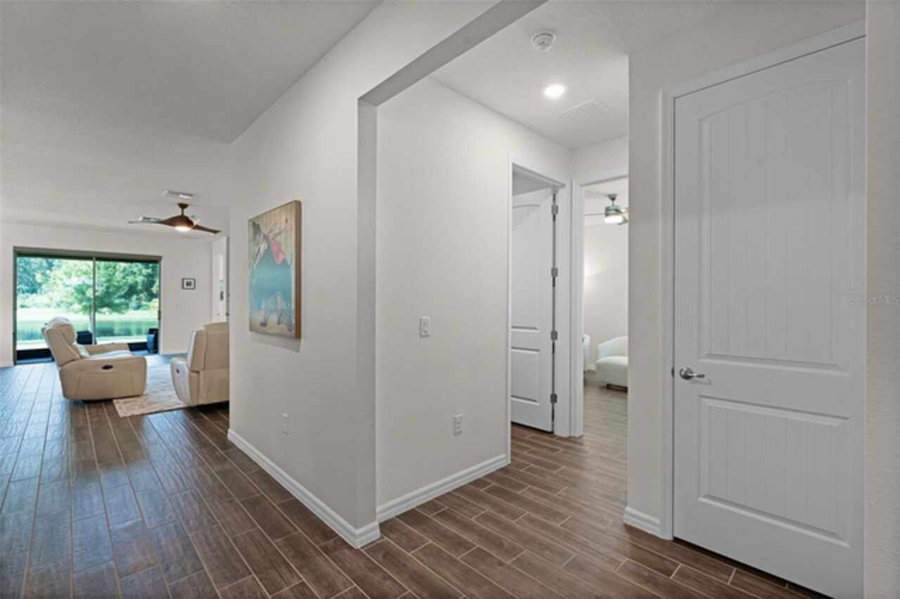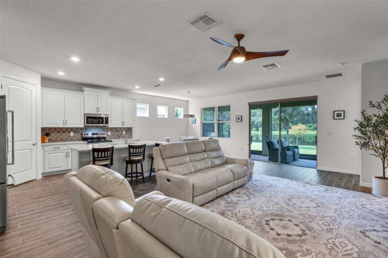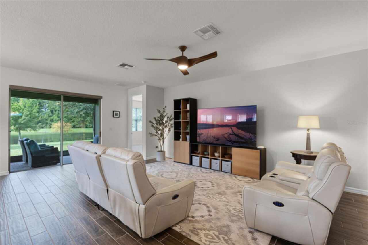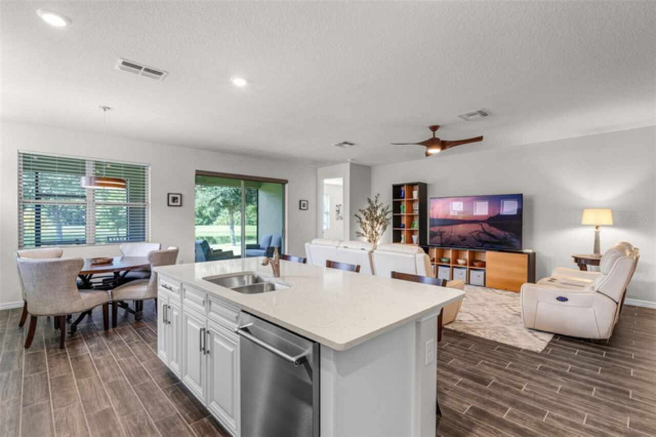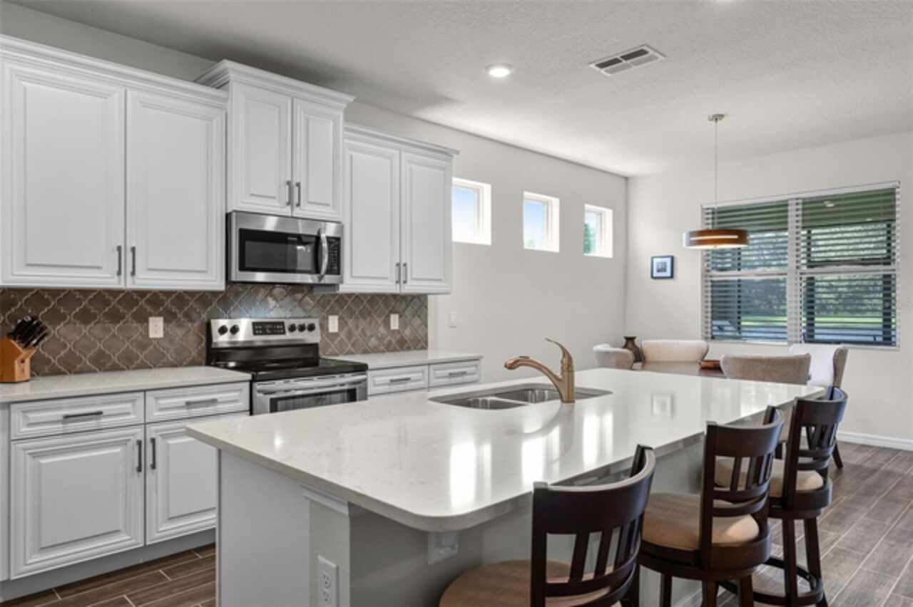 Under contract-accepting backup offers. Water & Conservation Views – Premier Lot! Welcome home to the largest floor plan in The Palms at Serenoa, Clermont’s premier 55+ gated community offering resort-style living just 25 minutes from Walt Disney World. This stunning four-bedroom, two-bathroom single-story home offers 2, 034 square feet of open living space on a premier waterfront lot with tranquil conservation views. The stone elevation, paved driveway, and fresh exterior paint completed in 2025 create beautiful curb appeal. Inside, extended wood-look tile floors, eight-foot doors, and abundant natural light flow through an open-concept design that seamlessly connects the great room, dining area, and gourmet kitchen. The kitchen is a showstopper with a large quartz island, stainless steel appliances, upgraded 42-inch soft-close cabinets with crown molding, a beautiful backsplash, and a custom walk-in pantry. The spacious dining area features a picturesque window overlooking the water and opens into the inviting living room. From there, sliding doors lead to the screened and covered lanai with brick pavers—the perfect spot for morning coffee or evening relaxation while enjoying serene water and nature views. The private primary suite is tucked at the rear of the home with peaceful water views and two walk-in closets. Its beautifully appointed bathroom includes a large walk-in shower, dual sinks, an expansive vanity, and a private water closet. Three additional bedrooms and a second full bathroom provide flexible space for guests, hobbies, or a home office, while the laundry room with a utility sink adds convenience. Thoughtful upgrades elevate this home, including a new roof and gutters installed in 2023, a whole-house water filtration and softener system added in 2025, and fresh exterior paint. With no waiting for construction and a premier lot location, this home is move-in ready. Life at The Palms at Serenoa is centered around an active lifestyle. Residents enjoy a heated resort-style pool with lap lanes, a state-of-the-art fitness and yoga studio, pickleball and bocce courts, a clubhouse with activity rooms, and a full-time lifestyle director who plans daily events and social gatherings. Scenic walking and biking trails, dog parks, and the convenience of included lawn care and internet make life here truly effortless. With just 570 homes, the community provides an intimate neighborhood feel while keeping you close to everything Clermont has to offer. The upcoming Sawgrass Boulevard extension will provide direct access to Winter Garden, Horizon West, and Disney, while Historic Downtown Clermont offers charming restaurants, boutique shopping, a weekly farmers market, and beautiful waterfront parks. You’ll also be just minutes from the upcoming Olympus in Clermont, a fully integrated destination offering an array of health, wellness, sports, and entertainment facilities that will bring exciting new amenities and experiences to the area. This home combines a premier lot, modern upgrades, and a vibrant 55+ lifestyle in a gated community that truly has it all. Schedule your showing today! Be sure to check out the video tour: http://bit.ly/4mzJXq3