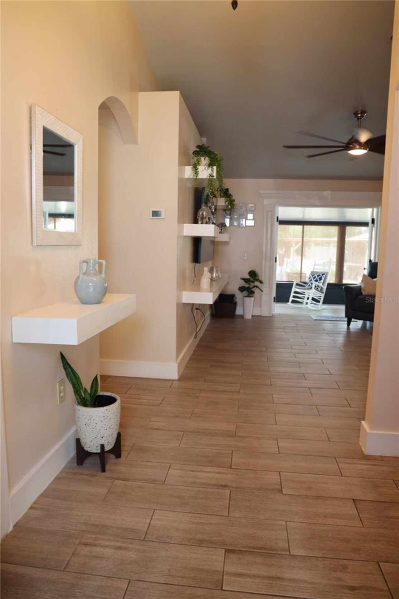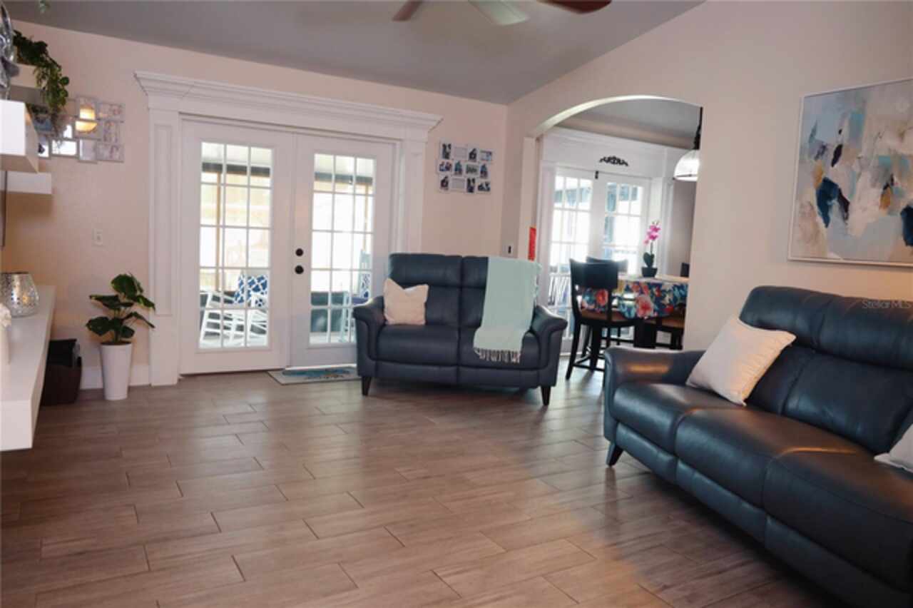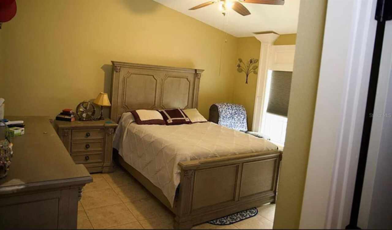 Discover comfort and privacy in this beautiful home, perfectly situated on a secluded cul-de-sac. The split floor plan ensures personal space, while the oversized lot is ideal for outdoor activities. Enjoy mornings on the screened-in front patio or relax in the cozy Florida room. A stand-alone shed/utility room (12ft x 20ft) adds extra storage. The kitchen is a showstopper with custom cabinetry, WOOD CYPRESS countertops, and a CERAMIC tile backsplash. Stainless steel appliances and ample storage make it both stylish and functional. Located in Greater Groves, enjoy a community pool, play area, and sports courts for just a $550 annual HOA fee. Minutes from shopping, dining, and 20 minutes from Disney, this home is perfect for full-time living or as a vacation rental. Key Features: NEW ROOF UNDER A YEAR OLD, Two-car garage with extra storage, Screened-in front patio & Florida room, Stand-alone shed/utility room and Low annual HOA fee: $550