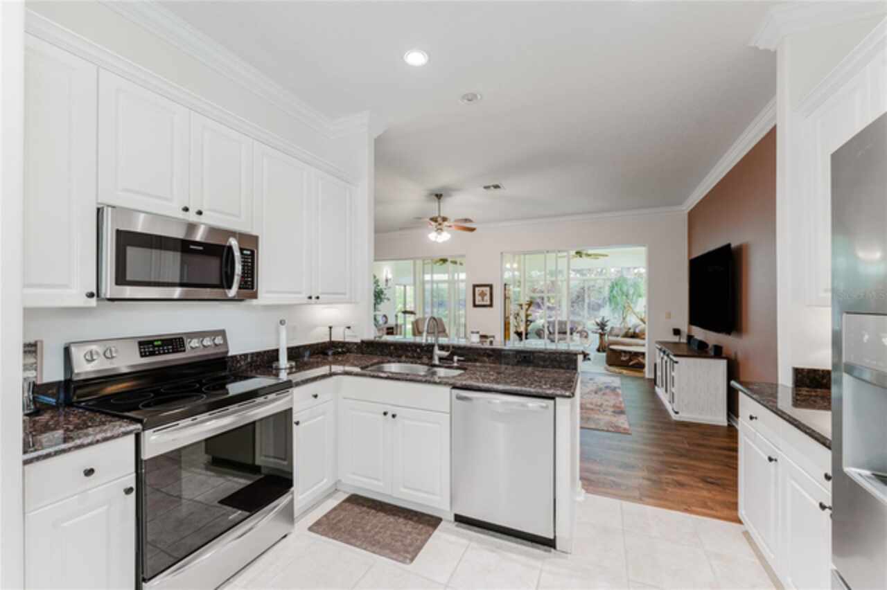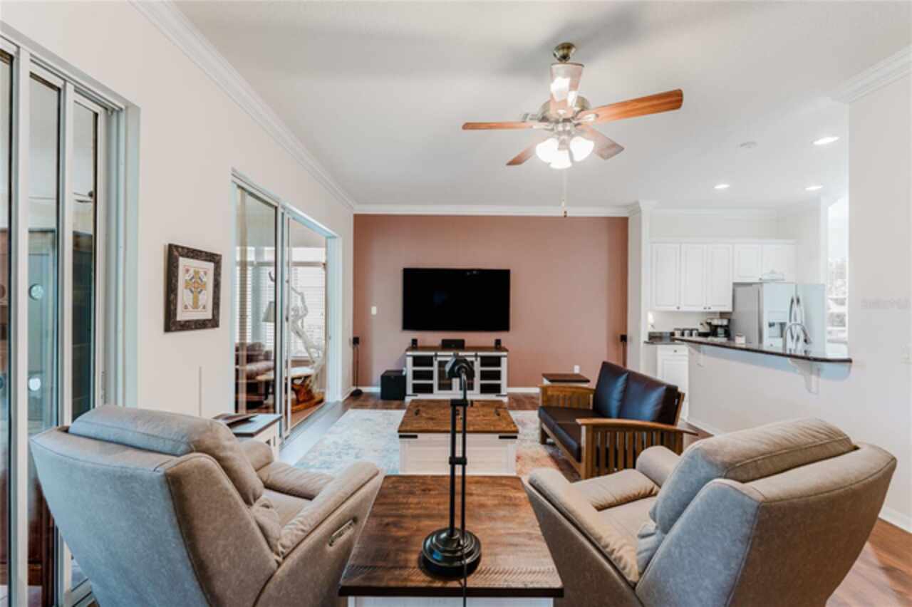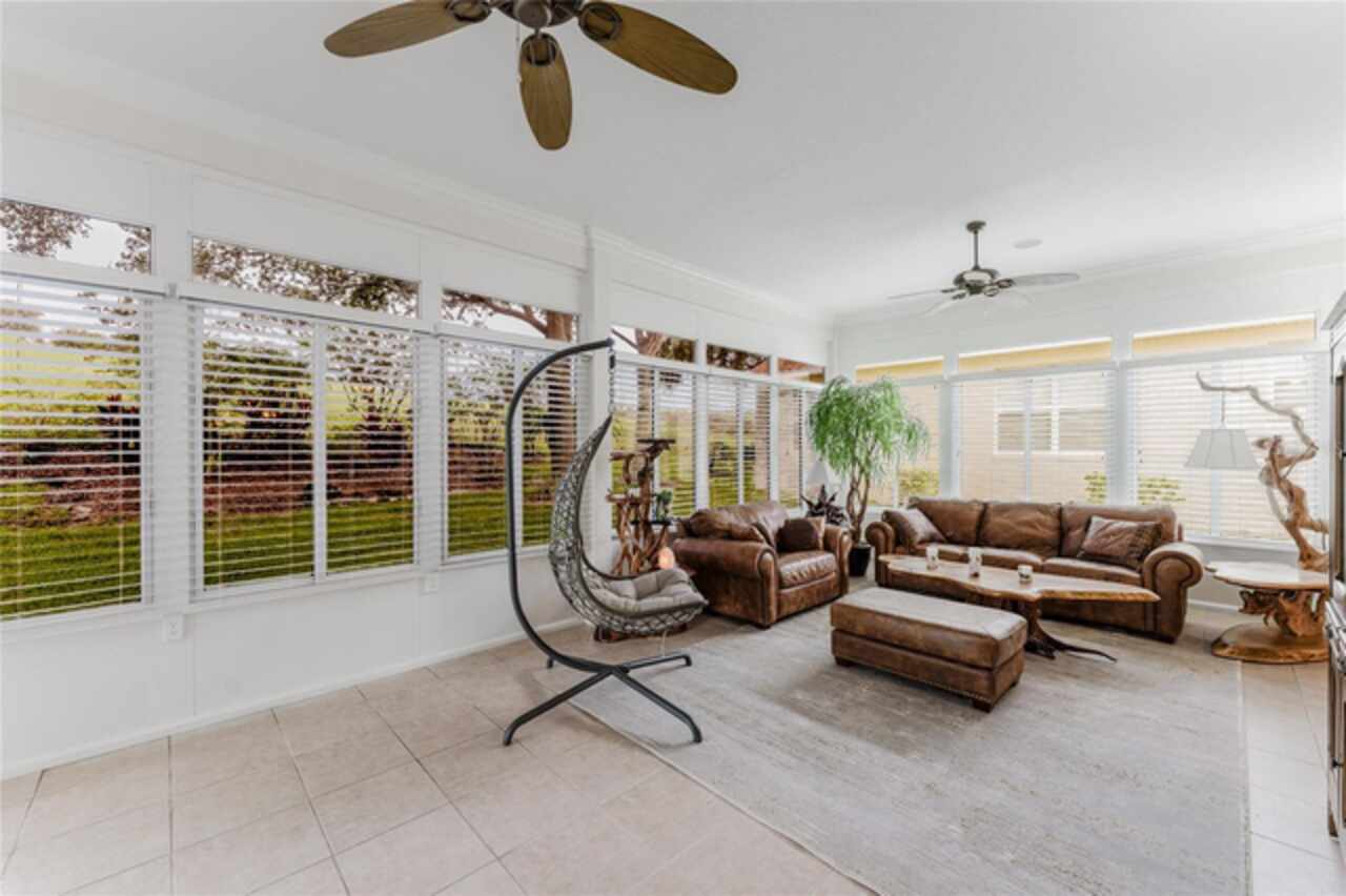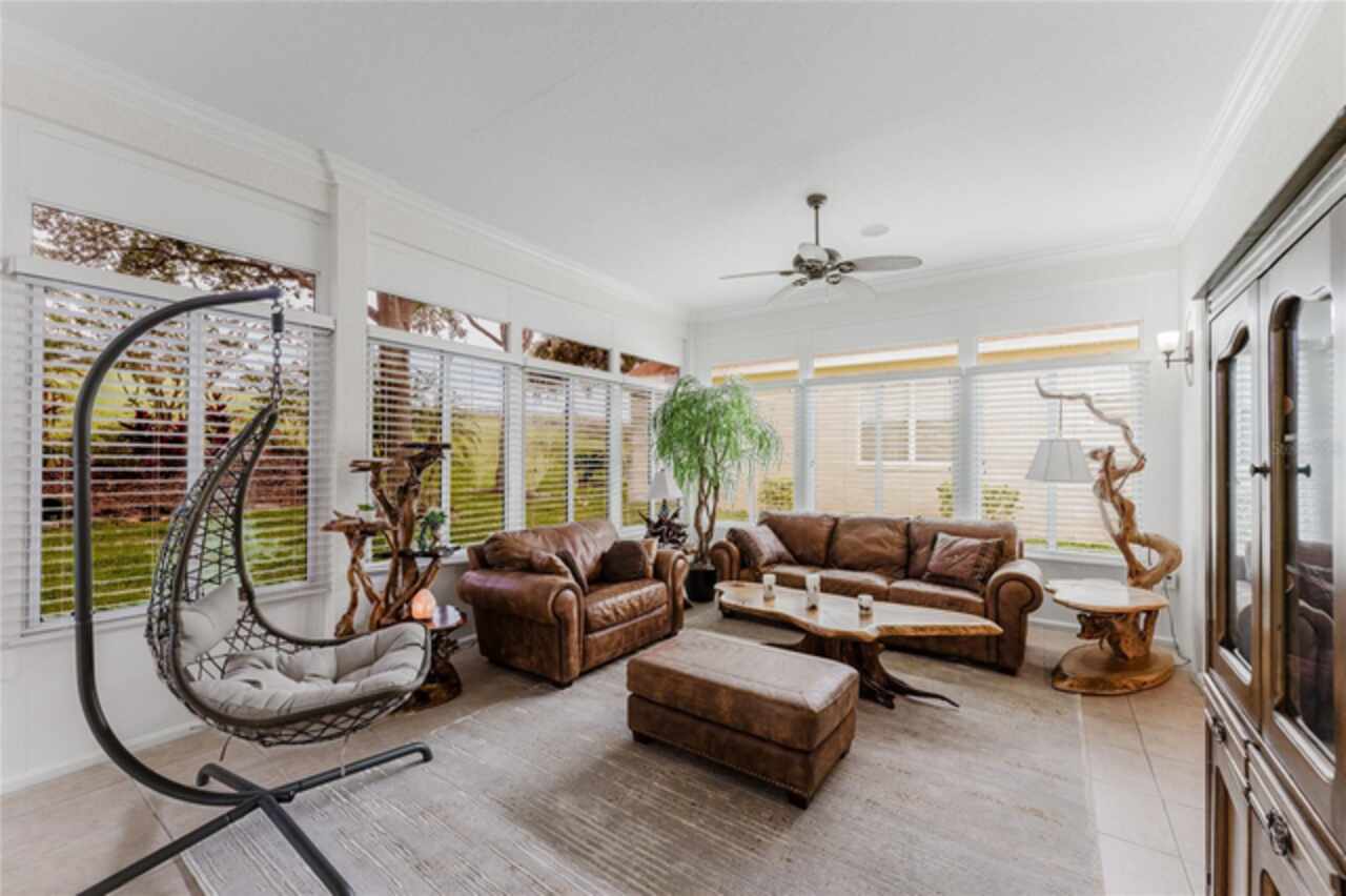 Discover HIGH-VALUE, WORRY-FREE living in this beautifully maintained 3-BEDROOM, 2-BATH home offering 1, 886 square feet of OPEN-CONCEPT living space—plus 364 ADDITIONAL SQUARE FEET in the FINISHED THREE-SEASON SUNROOM overlooking a lush, landscaped backyard with NO REAR NEIGHBORS for maximum privacy. Enjoy seamless indoor-outdoor living by opening the trio of sliding glass doors to take in the tranquil views, or begin your day on the screened front porch (with no-see-um mesh) ideal for your morning coffee and watching the sunrise. Located on a QUIET, LOW-TRAFFIC CUL-DE-SAC, this home provides peace of mind with a BRAND-NEW ROOF AND GUTTERING (June 2025), a high-efficiency A/C and furnace, and newer stainless steel Whirlpool appliances—including refrigerator, stove, microwave, and dishwasher. Stylish design upgrades include granite countertops, rounded corners, architectural arches, large ceramic tile, laminate flooring throughout—no carpet!—and crown molding accenting the entire home. The spacious open floor plan is perfect for entertaining or relaxed living. The HOA includes yard mowing, shrub trimming, expanded TV, and high-speed internet, offering true low-maintenance convenience. Located in Summit Greens, a gated 55+ community with 24-HOUR SECURITY, residents enjoy a wide range of amenities: clubhouse with classes and social activities, indoor/outdoor pools, sauna, hot tub, billiard room, ballroom, tennis, shuffleboard, and pickleball courts. Adjacent to the Clermont National Golf Course, enjoy access to The View—a modern venue with state-of-the-art driving range, restaurant, and outdoor food court with live music, big screen TVs, and panoramic views of Central Florida. This is active 55+ living at its best—schedule your private showing today!
