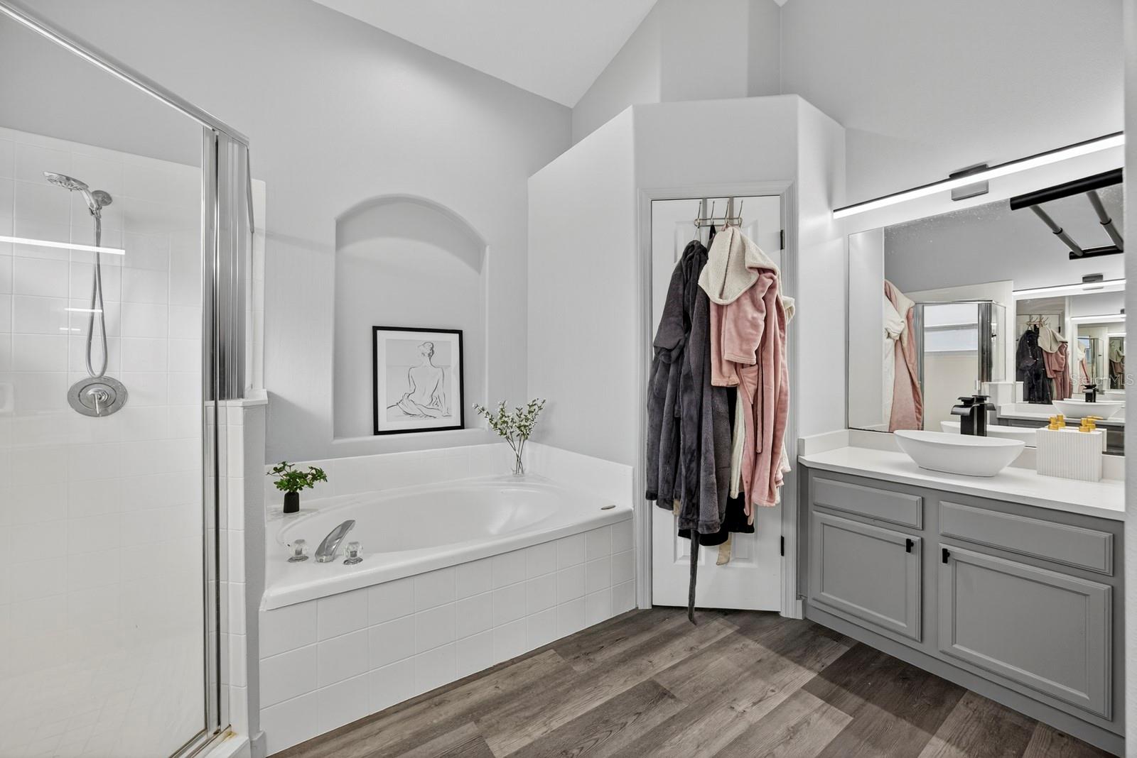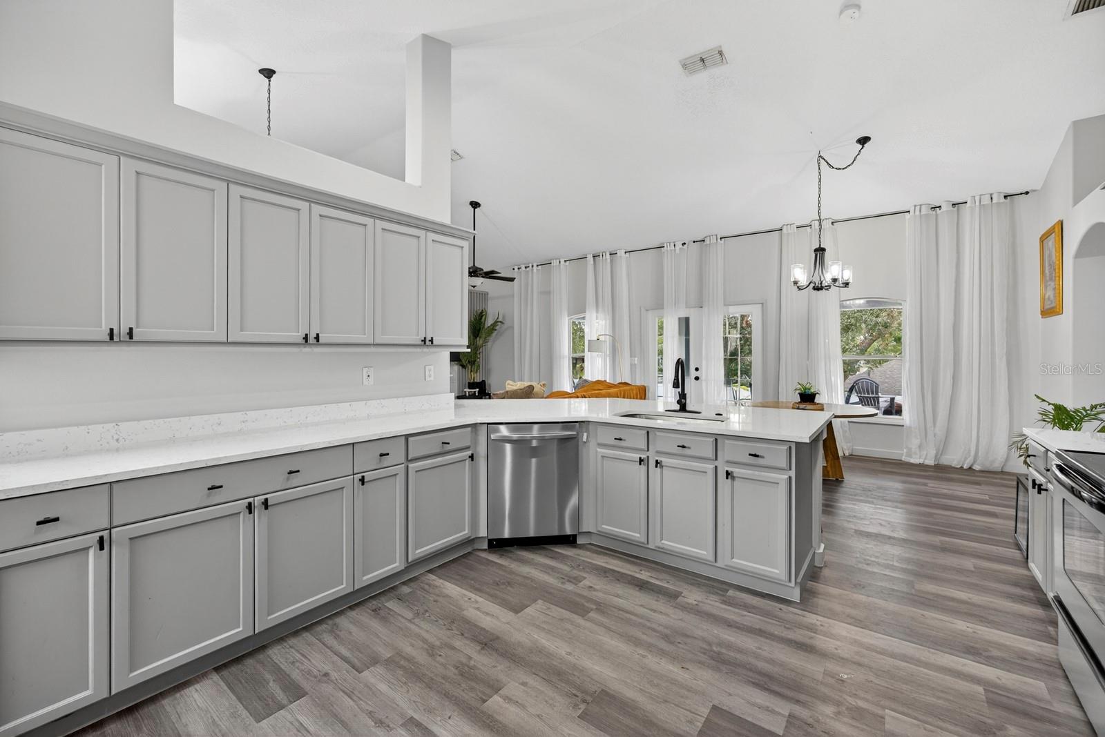 Step into this beautifully updated 3-bedroom, 2-bath home with a den, tucked inside the gated community of The Hills of Clermont. The property has been fully renovated and is move-in ready, offering a bright, open layout that feels fresh the moment you walk in. The front den makes a great office or flex space and is currently set up as a second dining area. The main living area flows easily between the family room, dining space, and kitchen, with a custom accent wall adding a unique touch. Large glass doors showcase the backyard and bring in plenty of natural light. The remodeled kitchen features Quartz counters, upgraded cabinetry, and generous storage. The private owner’s suite sits on its own side of the home and includes a modern, refreshed bathroom. Two additional bedrooms and a hallway linen closet are located on the opposite side for comfortable separation. The backyard is fully fenced with vinyl and offers plenty of space to entertain, plus convenient access to a full bathroom directly from outside. Additional perks include a laundry room, a two-car garage, Newer Roof (4yrs) and a newer water heater (1 yr). The Hills of Clermont puts you close to everything: lakes, parks, recreation, top medical facilities, dining, and major conveniences—perfect for anyone seeking a balanced Central Florida lifestyle.