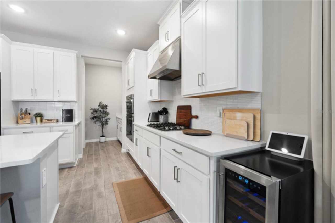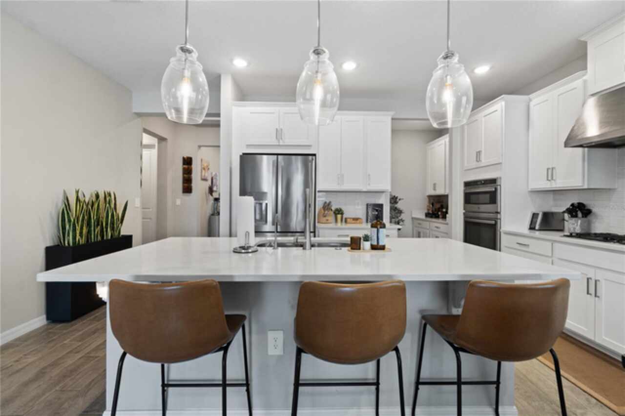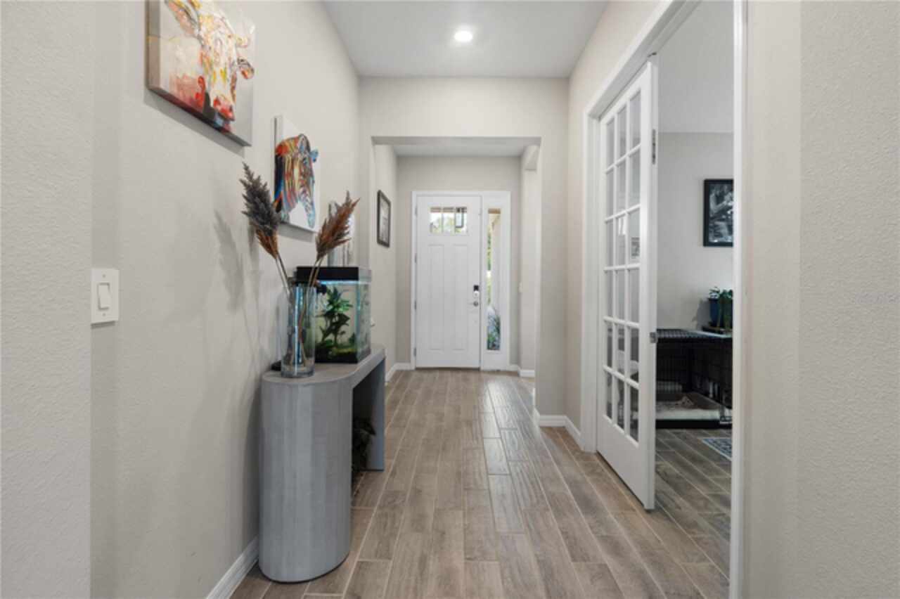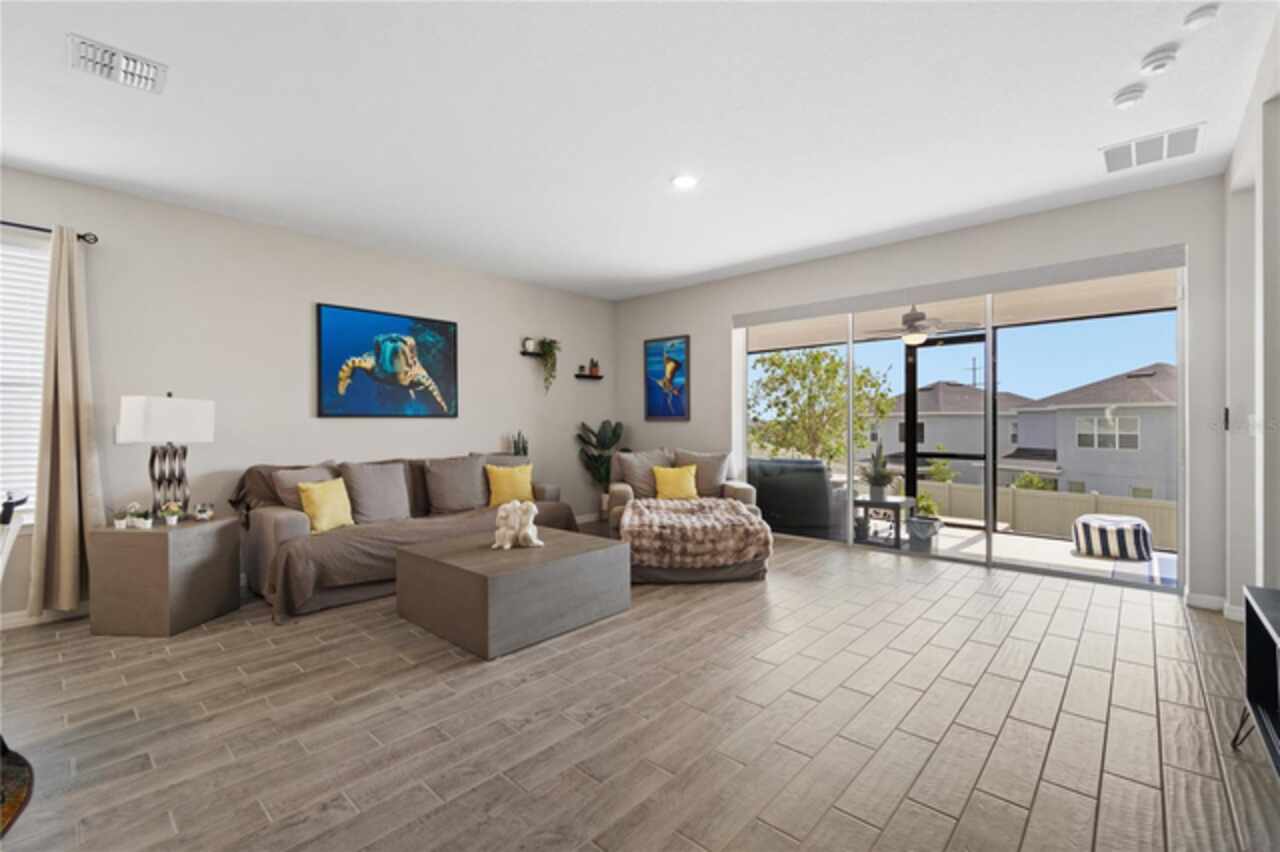Discover this immaculate 2, 399 sq ft residence perfectly located in one of Clermont’s most sought-after neighborhoods. This spacious and beautifully appointed home in a culdesac features 4 bedrooms and 3 bathrooms and a private study with glass French doors, ideal for home office or quiet reading space. Step inside to find high ceilings, abundant natural light, and a flowing open floor plan that effortlessly connects the formal living and dining area to a spacious family room and modern kitchen. The gourmet kitchen offer stainless steel appliances, quartz countertops, a breakfast bar, , and plenty of cabinetry perfect for both everyday living and entertainment. A standout feature is the pocket -style sliding glass door that fully retracts, creating a seamless transition to the outdoors. Outfitted with built in automatic blinds that leads to a large screened in lanai, offering the perfect space for relaxing, dining or enjoying Florida’s year round sunshine in comfort and privacy. The primary suite is generally sized and includes a walk in closet and luxurious en-suite bathroom with dual vanities, a soaking tub, and a separate walk in shower. Situated just minutes from top notch schools, shopping, dining, and Clermont’s beautiful chain of lakes, this home offers the perfect balance of convenience and tranquility. With easy access to major highways, you’re just a short drive from Orlando’s theme parks, airport, and downtown attractions. Don’t wait. Make this home yours today!!!!