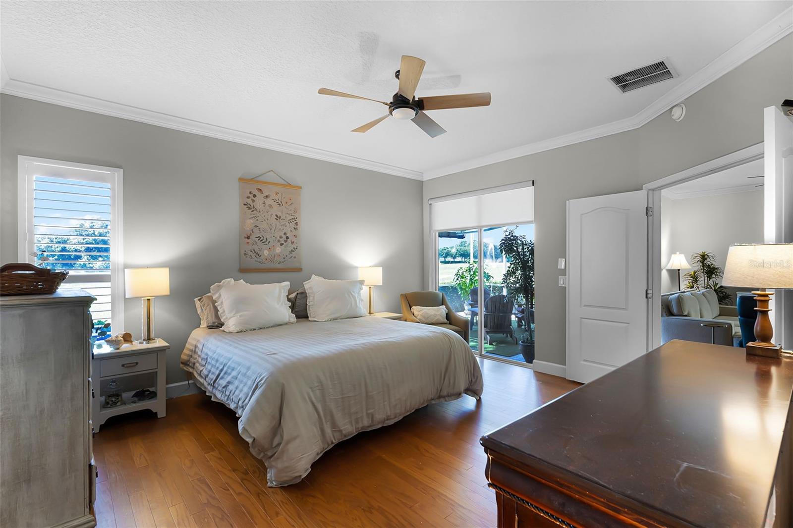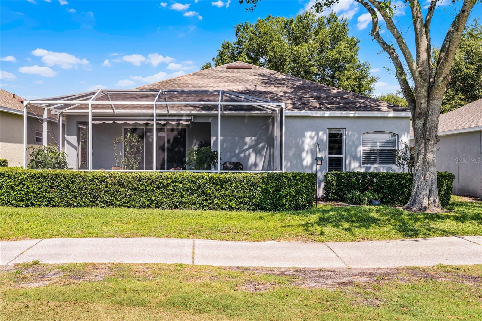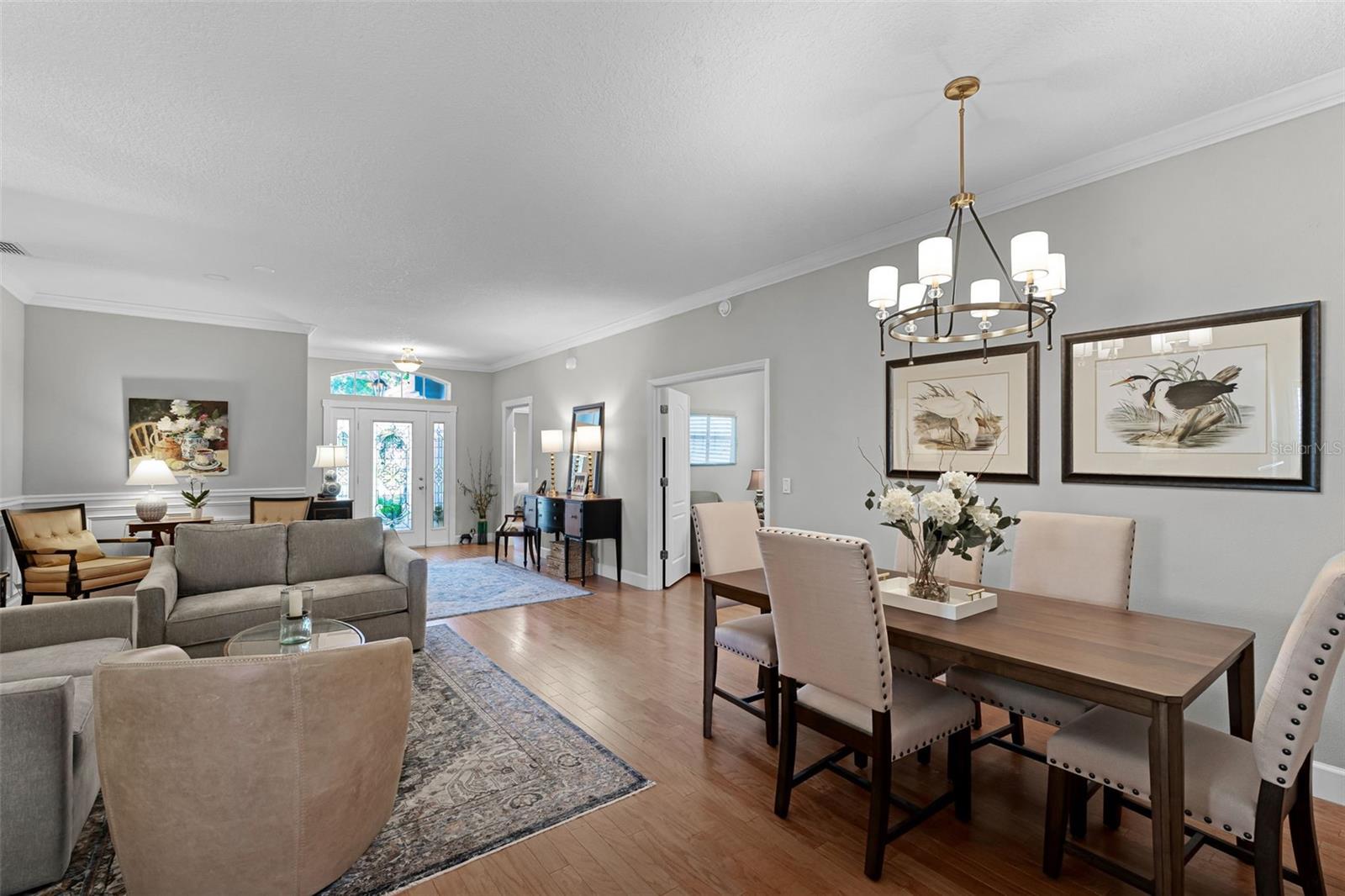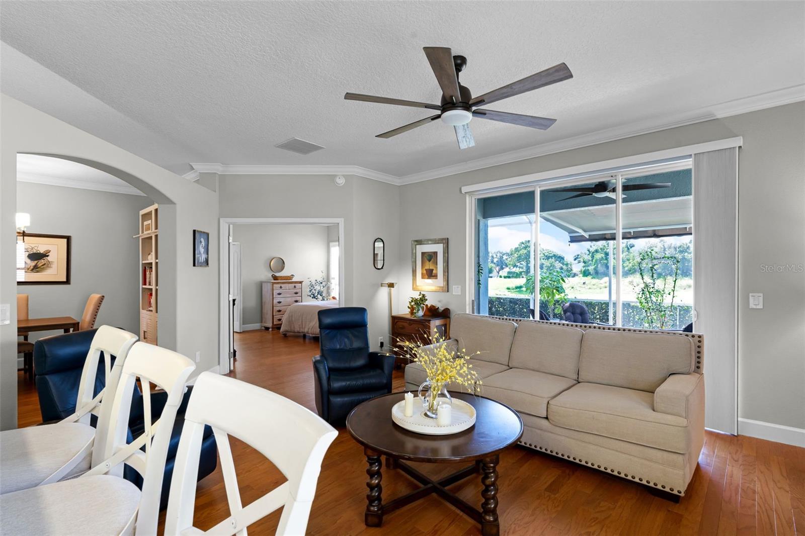 Welcome to this beautifully updated St. Regis model home in the highly sought-after 55+ community of Kings Ridge, perfectly situated on the 5th hole of the Championship Golf Course. This spacious 2 bedroom, 2 bath home with a private den has been thoughtfully upgraded throughout, featuring a fully remodeled kitchen with rich wood cabinetry, granite countertops and backsplash, under-cabinet lighting, soft-close doors, and stainless steel appliances. Elegant engineered wood floors flow seamlessly through the home, complemented by crown molding and plantation shutters. The versatile floorplan offers both a living room and family room, ideal for entertaining, while the den with double doors provides flexible space for an office or guest room. The expansive primary suite includes lanai access, a large walk-in closet, and a luxurious en suite bath with dual vanities, a garden tub, walk-in shower, and upgraded cabinetry. Enjoy peaceful sunsets and golf course views from the oversized screened lanai with a new motorized SUNPRO awning. Additional highlights include a new roof (2023), freshly painted exterior, an epoxy garage floor with built-in storage, workbench, and an APCO air filtration system for cleaner air. Kings Ridge residents enjoy a resort-style lifestyle with two golf courses, three heated pools, spas, tennis and pickleball courts, a fitness center, billiards, shuffleboard, clubs, and endless activities. The monthly maintenance fees cover lawn care, shrub trimming, irrigation system maintenance and water, Dish cable TV with fiber optic service through Opticaltel, internet, home phone, road maintenance, and exterior painting every 7 years—making life here worry-free. Plus, you can take your golf cart right to Kings Ridge Plaza to enjoy Publix, Starbucks, restaurants, shopping, and banking just minutes from your doorstep.