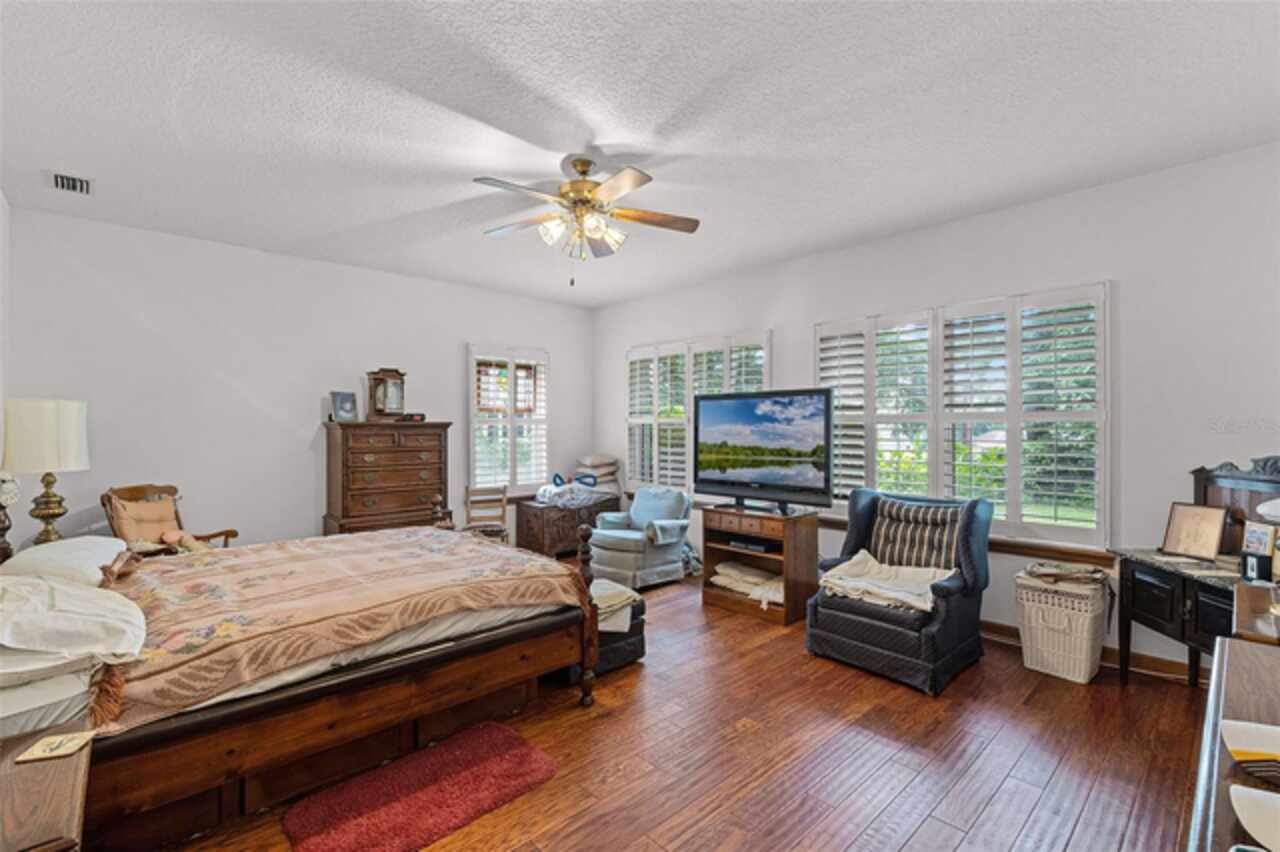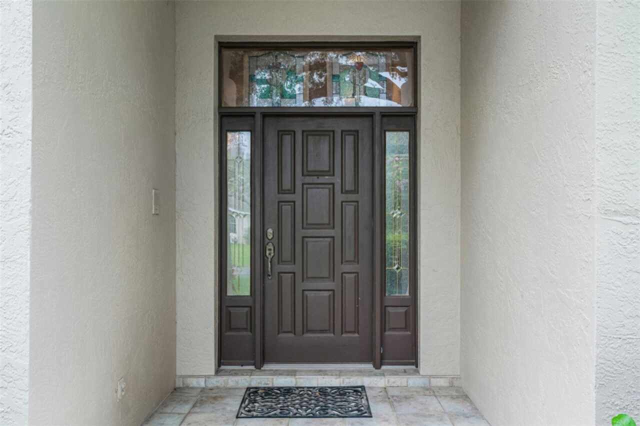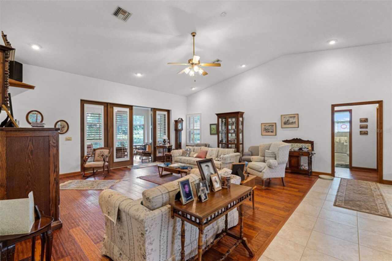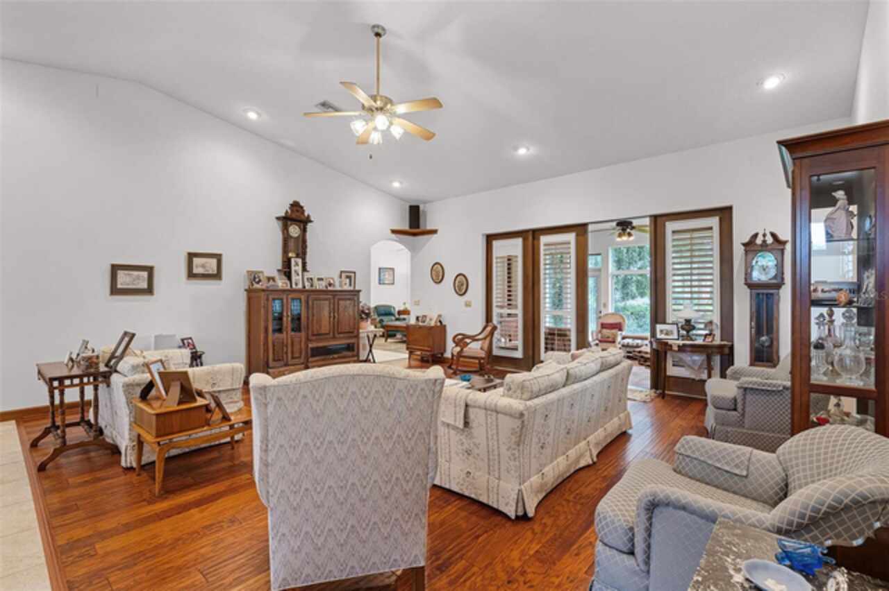 Stunning golf course home on Green Valley's 16th green. Discover a blend of luxury and leisure in this magnificent four-bedroom, three-bathroom home directly on the 16th green of the semi-private Green Valley golf course with affordable memberships. Spanning nearly 2, 800 square feet of thoughtfully designed living space, this exceptional property sits on over one-third of an acre across two lots, creating an expansive and private retreat framed by mature, gorgeous trees and impeccable landscaping. From the moment you arrive, you'll be captivated by the elegant solid wood entry door, adorned with sidelights and a large transom window that floods the foyer with natural light. Go inside to discover a formal dining room featuring rich wood floors and wood column accents that set the tone for the home's refined interior. The heart of the home centers around a spectacular living room with soaring vaulted ceilings and strategically placed recessed lighting that creates an atmosphere of grandeur. French doors seamlessly connect this space to a bonus Florida room, fully climate-controlled for year-round comfort and enjoyment. The kitchen boasts an abundance of solid wood cabinets, solid surface countertops and built-in ovens complemented by a cooktop positioned on the center island. The thoughtful design includes a convenient breakfast bar, space for casual dining, and under-cabinet lighting that illuminates the workspace beautifully. This opens to the family room, where stunning golf course views create a serene backdrop for daily living and entertaining. The luxurious primary suite offers a sanctuary with generous proportions, an expansive walk-in closet, and a spa-like bath featuring dual sinks, a wide-entry shower and a relaxing garden tub. Throughout the home, plantation shutters provide privacy and classic elegance, while ceiling fans and recessed lighting enhance comfort and ambiance in every room. Practical amenities include a full two-car garage and an additional golf cart garage, ideal for the avid golfer. The property benefits from an exceptionally low HOA fee that covers professional lawn care and access to the community pool, shared among only 13 exclusive lots in this intimate enclave within Green Valley. Location couldn't be more convenient, with a shopping center featuring essential services, retail shops, grocery stores and dining options less than three minutes away. World-class attractions including Orlando International Airport, Disney World and Universal Studios are all within an hour's drive, while major roadways provide easy access throughout Central Florida. This remarkable home represents a rare opportunity to own a piece of paradise where golf course living meets luxurious comfort in one of the area's desirable communities.