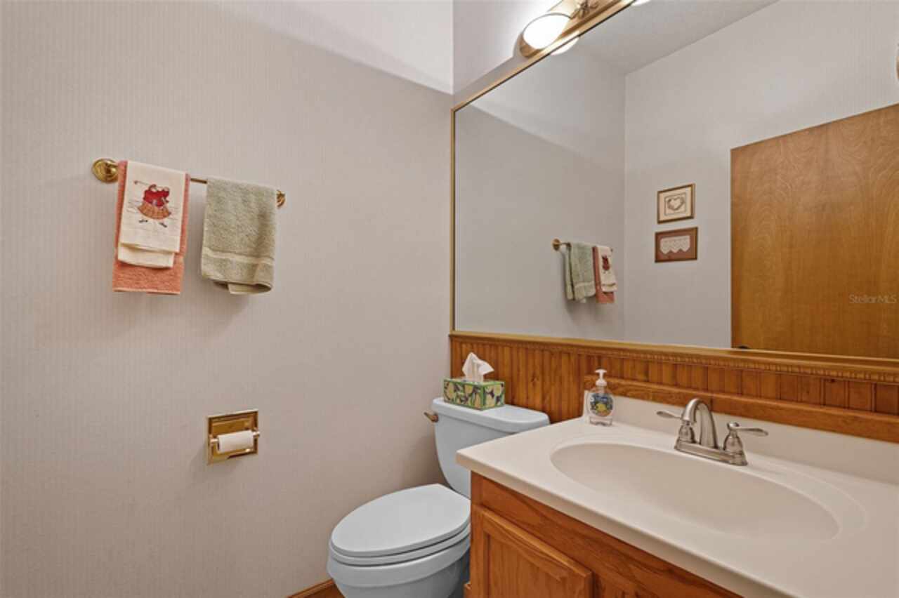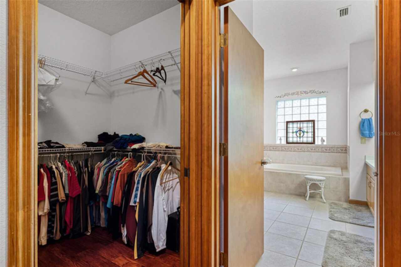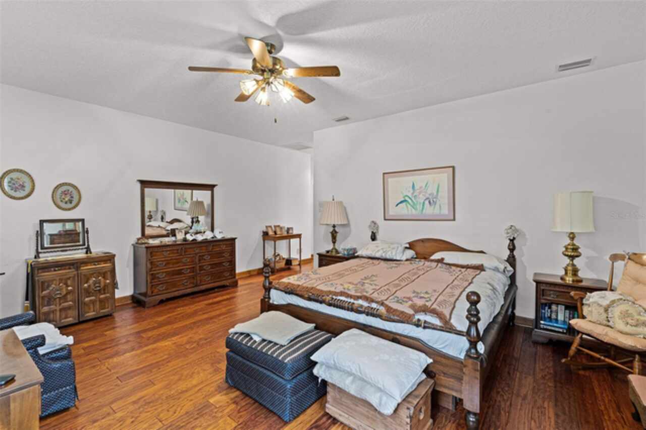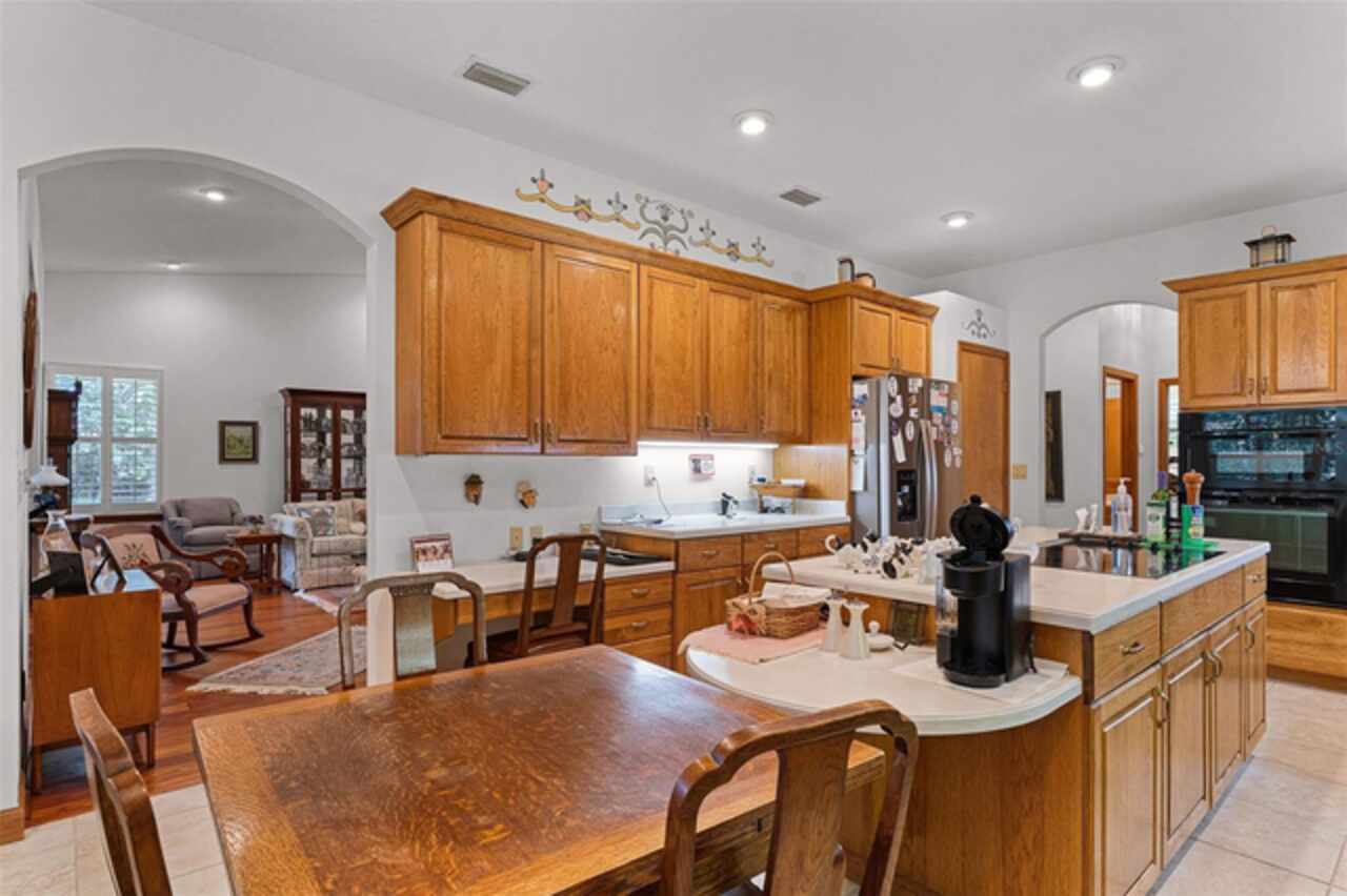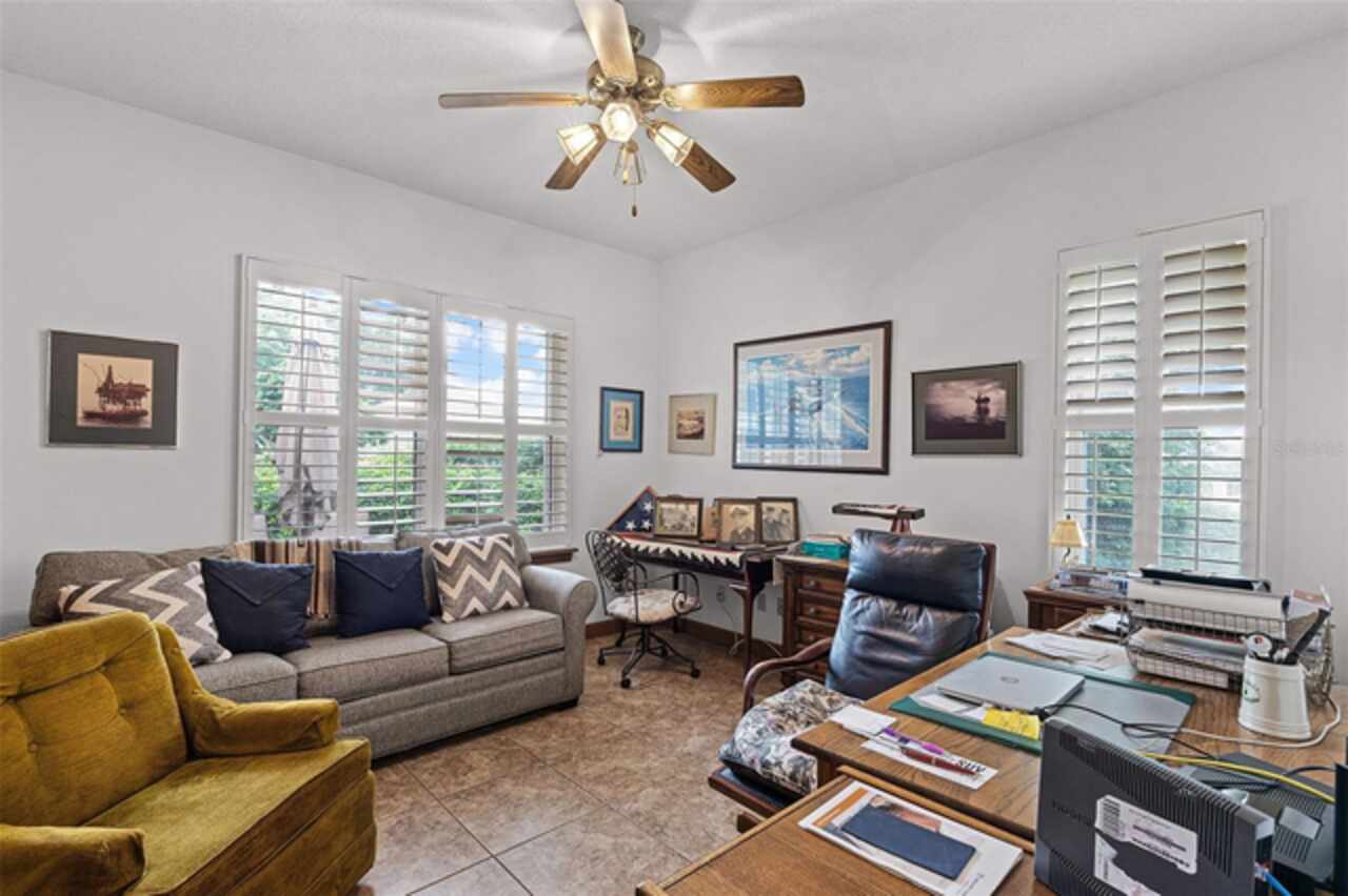 Stunning golf course home on Green Valley's 16th green. Discover a blend of luxury and leisure in this magnificent four-bedroom, three-bathroom home directly on the 16th green of the semi-private Green Valley golf course with affordable memberships. Spanning nearly 2, 800 square feet of thoughtfully designed living space, this exceptional property sits on over one-third of an acre across two lots, creating an expansive and private retreat framed by mature, gorgeous trees and impeccable landscaping. From the moment you arrive, you'll be captivated by the elegant solid wood entry door, adorned with sidelights and a large transom window that floods the foyer with natural light. Go inside to discover a formal dining room featuring rich wood floors and wood column accents that set the tone for the home's refined interior. The heart of the home centers around a spectacular living room with soaring vaulted ceilings and strategically placed recessed lighting that creates an atmosphere of grandeur. French doors seamlessly connect this space to a bonus Florida room, fully climate-controlled for year-round comfort and enjoyment. The kitchen boasts an abundance of solid wood cabinets, solid surface countertops and built-in ovens complemented by a cooktop positioned on the center island. The thoughtful design includes a convenient breakfast bar, space for casual dining, and under-cabinet lighting that illuminates the workspace beautifully. This opens to the family room, where stunning golf course views create a serene backdrop for daily living and entertaining. The luxurious primary suite offers a sanctuary with generous proportions, an expansive walk-in closet, and a spa-like bath featuring dual sinks, a wide-entry shower and a relaxing garden tub. Throughout the home, plantation shutters provide privacy and classic elegance, while ceiling fans and recessed lighting enhance comfort and ambiance in every room. Practical amenities include a full two-car garage and an additional golf cart garage, ideal for the avid golfer. The property benefits from an exceptionally low HOA fee that covers professional lawn care and access to the community pool, shared among only 13 exclusive lots in this intimate enclave within Green Valley. Location couldn't be more convenient, with a shopping center featuring essential services, retail shops, grocery stores and dining options less than three minutes away. World-class attractions including Orlando International Airport, Disney World and Universal Studios are all within an hour's drive, while major roadways provide easy access throughout Central Florida. This remarkable home represents a rare opportunity to own a piece of paradise where golf course living meets luxurious comfort in one of the area's desirable communities.