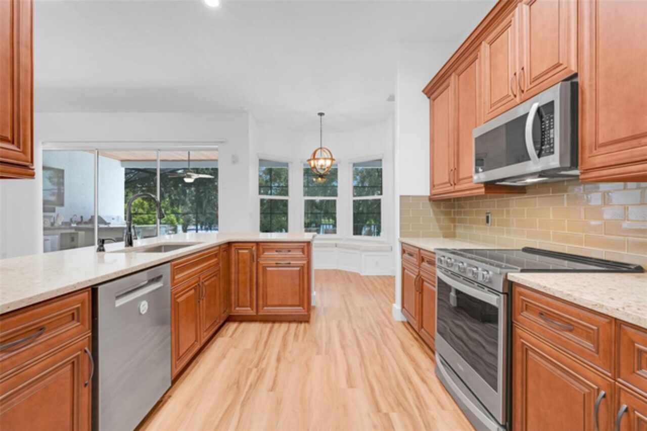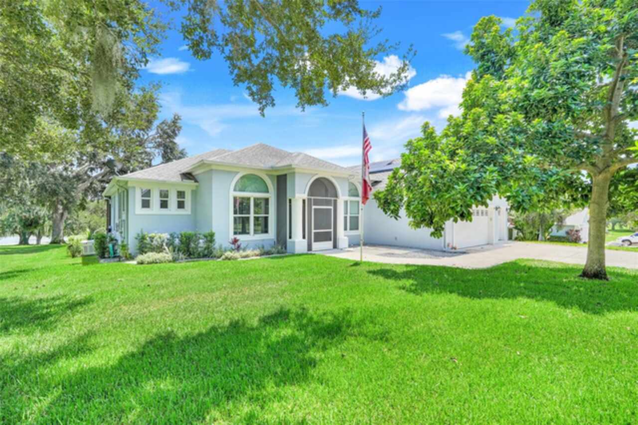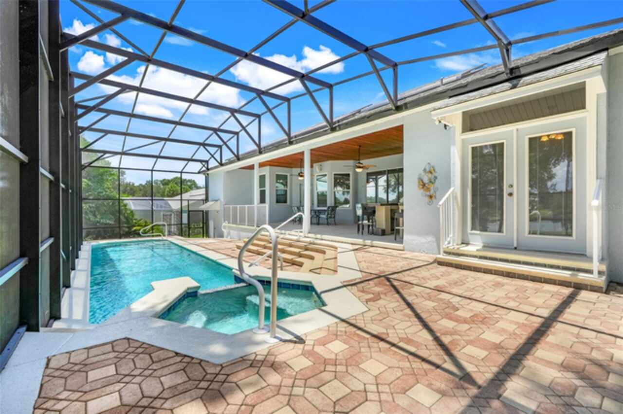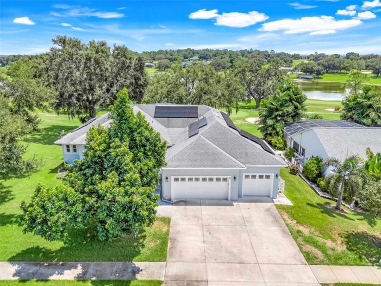 Under contract-accepting backup offers. One or more photo(s) has been virtually staged. Located in the desirable Green Valley community in Clermont, this stunning 3-bedroom, 2-bath home sits on a quiet cul-de-sac and has been completely renovated from top to bottom, offering modern elegance paired with breathtaking golf course and lake views. From the moment you step through the front door, you’re greeted with a striking open floor plan where your eyes travel straight through the living room, across the sparkling pool, and out to the serene lake and golf course beyond. The chef’s kitchen has been fully renovated with custom cabinetry, quartz counters, stainless steel appliances, and a charming breakfast nook with a built-in storage bench overlooking the pool. Just off the kitchen, the dining room showcases a custom built-in buffet with wine cooler, adding both style and function while creating the perfect space for entertaining. The private master suite is positioned at the back of the home, designed to maximize both comfort and views. Elegant French doors lead directly to the lanai and pool area, inviting in natural light and offering a seamless indoor-outdoor lifestyle. The renovated en-suite bathroom showcases a modern shower, cabinetry, and upgraded flooring. Both secondary bedrooms are generously sized and share a beautifully updated second bathroom that has been completely redesigned with updated walk-in shower, cabinetry, and flooring. Step outside to your own private resort: a heated, saltwater pool anchors the expansive lanai. Designed with entertaining in mind, the outdoor area features multi-level decking with detailed brick pavers, creating plenty of space for lounging, dining, or gathering with friends and family. The covered entertaining area showcases a beautiful wood-paneled ceiling with dual fans. Completing this resort-like retreat is the fully equipped outdoor kitchen with tile countertops, built-in grill, refrigerator, bar seating, sink, and mounted TV, ensuring every occasion is unforgettable—all while overlooking the lush greens and shimmering lake. Every major system and detail has been thoughtfully updated, including: FULLY PAID OFF WHOLE HOUSE SOLAR, GENERAC WHOLE HOUSE GENERATOR, A/C UNIT 2020, WHOLE HOUSE REPIPE 2018, WINDOWS REPLACED 2018, WATER TREATMENT SYSTEM, WELL FOR IRRIGATION, EPOXY COATED GARAGE FLOOR, NEWER GARAGE DOORS & POOL RESURFACED AND RESCREENED. Whether it’s morning coffee with a view, entertaining friends poolside, or enjoying peaceful evenings by the water, this home delivers the ultimate golf-front Florida lifestyle. Call today!