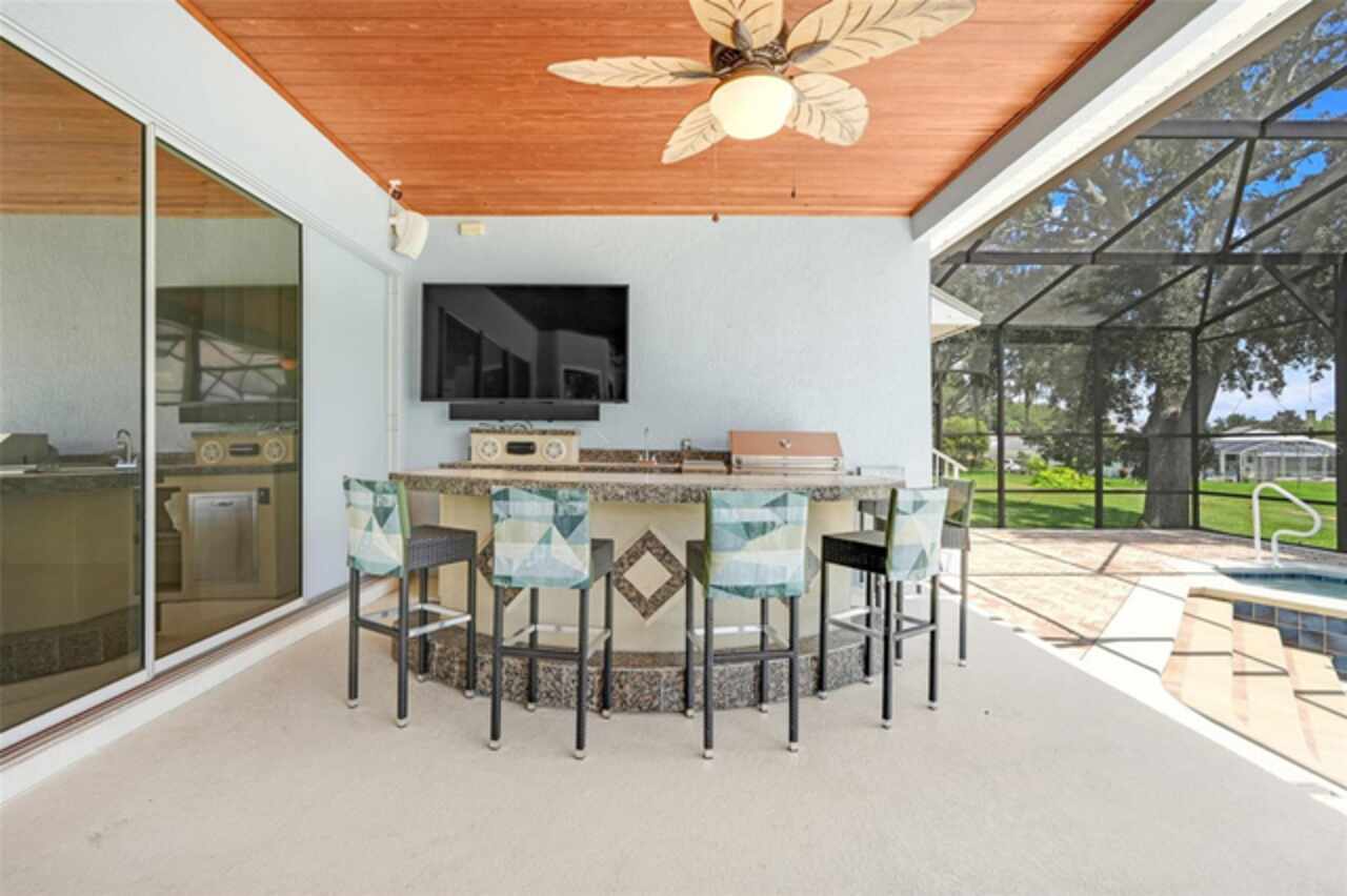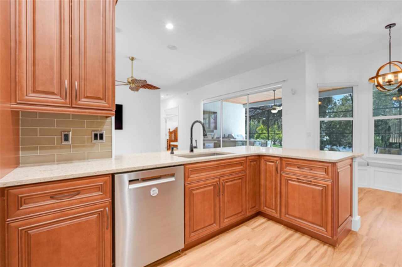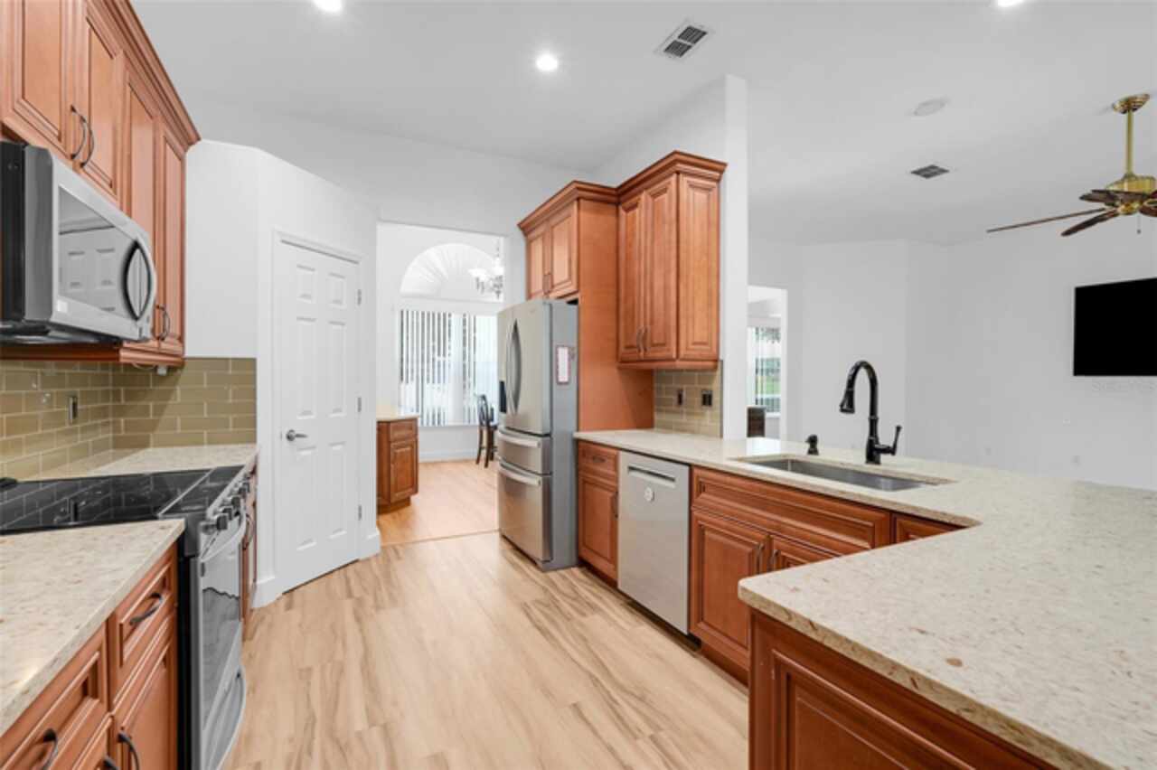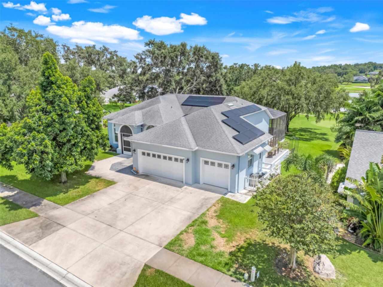 Under contract-accepting backup offers. One or more photo(s) has been virtually staged. Located in the desirable Green Valley community in Clermont, this stunning 3-bedroom, 2-bath home sits on a quiet cul-de-sac and has been completely renovated from top to bottom, offering modern elegance paired with breathtaking golf course and lake views. From the moment you step through the front door, you’re greeted with a striking open floor plan where your eyes travel straight through the living room, across the sparkling pool, and out to the serene lake and golf course beyond. The chef’s kitchen has been fully renovated with custom cabinetry, quartz counters, stainless steel appliances, and a charming breakfast nook with a built-in storage bench overlooking the pool. Just off the kitchen, the dining room showcases a custom built-in buffet with wine cooler, adding both style and function while creating the perfect space for entertaining. The private master suite is positioned at the back of the home, designed to maximize both comfort and views. Elegant French doors lead directly to the lanai and pool area, inviting in natural light and offering a seamless indoor-outdoor lifestyle. The renovated en-suite bathroom showcases a modern shower, cabinetry, and upgraded flooring. Both secondary bedrooms are generously sized and share a beautifully updated second bathroom that has been completely redesigned with updated walk-in shower, cabinetry, and flooring. Step outside to your own private resort: a heated, saltwater pool anchors the expansive lanai. Designed with entertaining in mind, the outdoor area features multi-level decking with detailed brick pavers, creating plenty of space for lounging, dining, or gathering with friends and family. The covered entertaining area showcases a beautiful wood-paneled ceiling with dual fans. Completing this resort-like retreat is the fully equipped outdoor kitchen with tile countertops, built-in grill, refrigerator, bar seating, sink, and mounted TV, ensuring every occasion is unforgettable—all while overlooking the lush greens and shimmering lake. Every major system and detail has been thoughtfully updated, including: FULLY PAID OFF WHOLE HOUSE SOLAR, GENERAC WHOLE HOUSE GENERATOR, A/C UNIT 2020, WHOLE HOUSE REPIPE 2018, WINDOWS REPLACED 2018, WATER TREATMENT SYSTEM, WELL FOR IRRIGATION, EPOXY COATED GARAGE FLOOR, NEWER GARAGE DOORS & POOL RESURFACED AND RESCREENED. Whether it’s morning coffee with a view, entertaining friends poolside, or enjoying peaceful evenings by the water, this home delivers the ultimate golf-front Florida lifestyle. Call today!