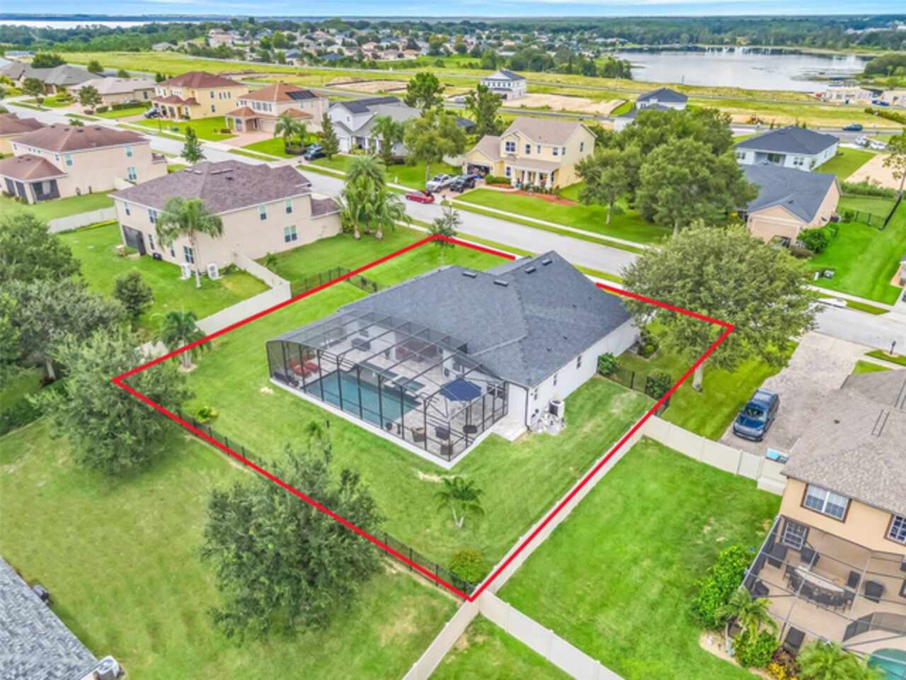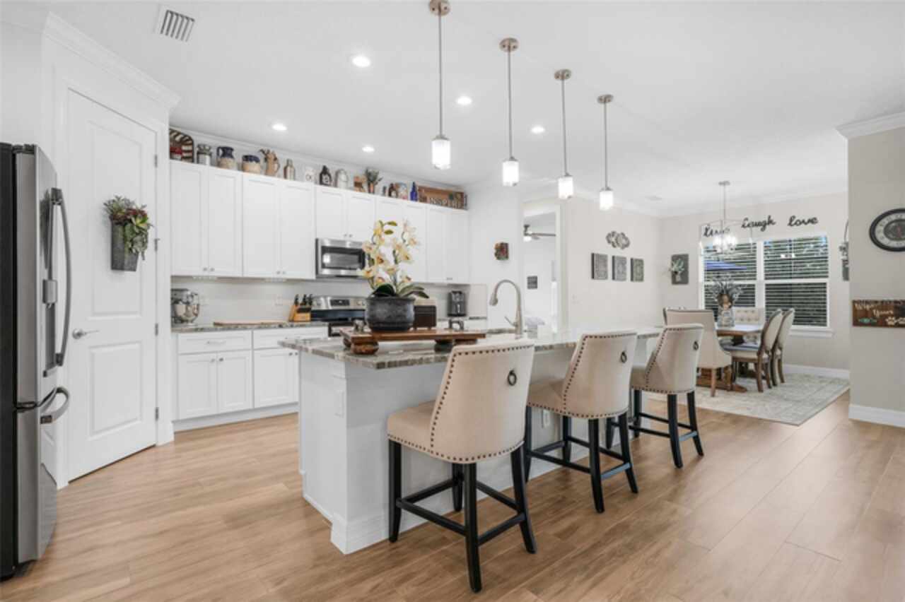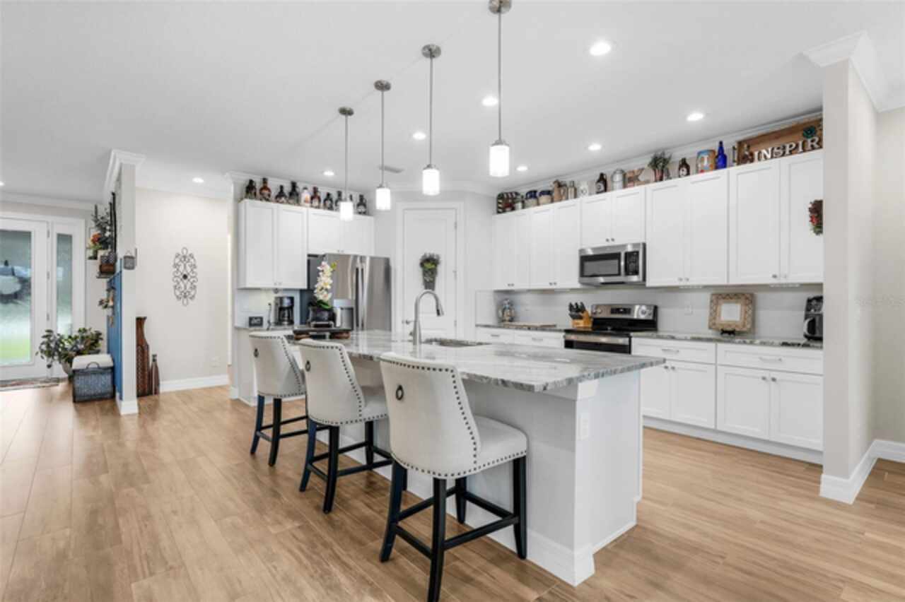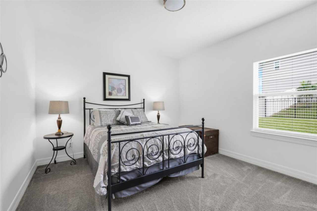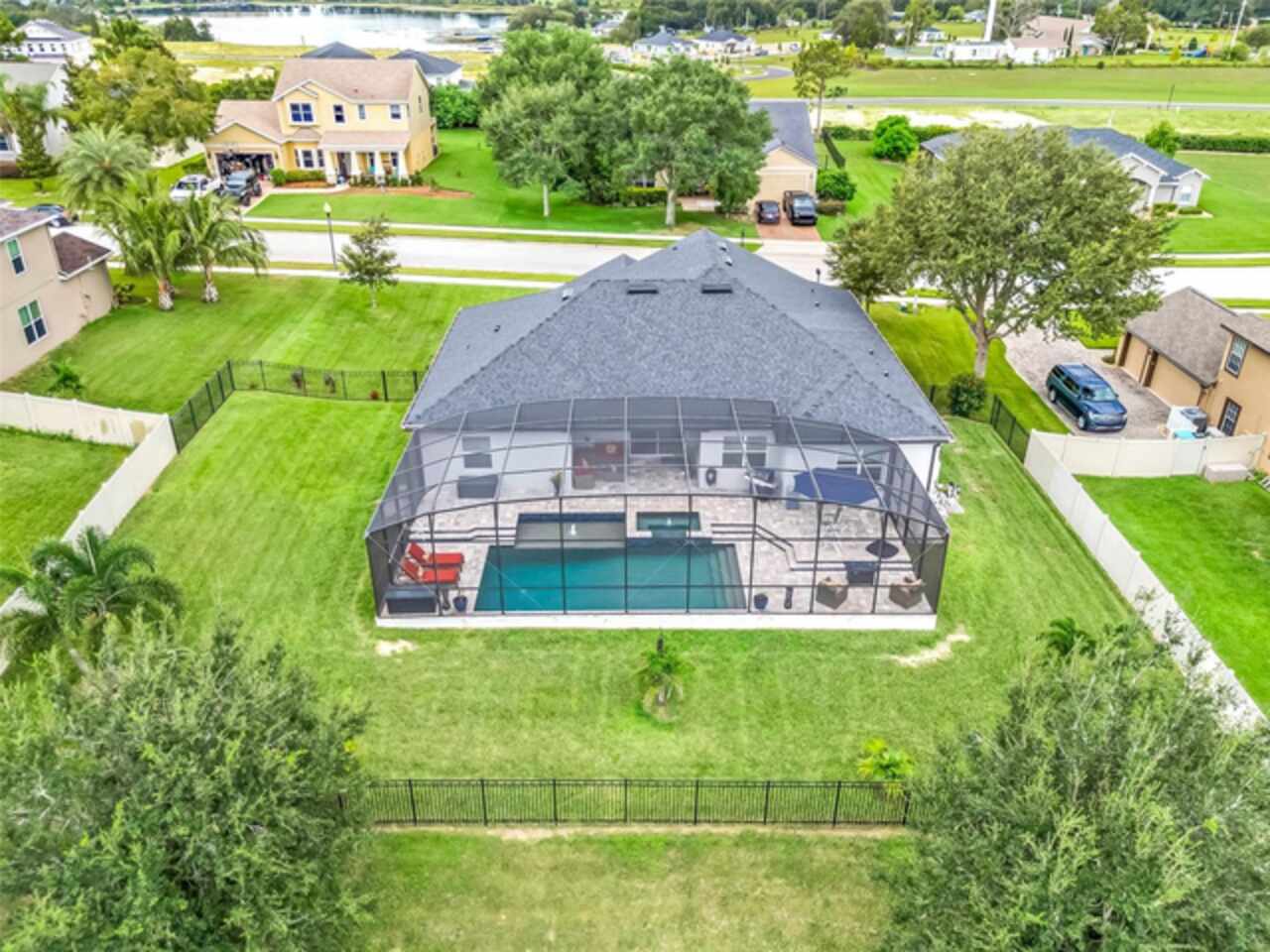 Under contract-accepting backup offers. The minute you pull up to this 2021 custom built home, you'll notice the eccentricity of what separates this one from the others. Stone facade, new exterior paint, and a wrought iron fence outlining the back of this .38 acre lot. Every inch of this home includes upgrades and high end finishes. From the volume tray ceilings trimmed with crown molding, to the abundance of recessed lighting, down to the 6 x 24 wood-like tile that lines the entire living space of the home. Modern luxury extends into the kitchen with the highest level of granite counter tops, 42" cabinets with soft close, stainless steel appliances, and pendant lighting over the extended island. The living room is equipped with surround sound & equipment hook up, allowing for your own theatre like experience at home. The three guest rooms are located on the East end of the home and offer a split use bathroom, enabling more than one person to get ready at once! The second guest bathroom is on the opposite side of the home, near the laundry room; keeping actual guests away from the occupant guest bathroom. The primary bedroom, on the West side of the home, is quite large, and offers a view of your private pool & spa. Dual sinks, a separate soaking tub & shower, and a walk-in closet is everything you need in your own private space. The 15 x 30 saltwater pool was just built in 2024, offering many more years of use. The 8 person built in spa is an added feature that doesn't exist in many homes. Lastly, the 6 x 12 sun shelf, in addition to the pool, is another amazing unique feature of this space. All surrounded by a screened lanai on top of a brick paved outdoor living space with a sunken patio. Over $150, 000 was spent making this area the perfect private oasis. This home also includes an upgraded, high efficiency, AC unit. This is one of the few newer communities in the Clermont area that have larger lot sizes. It's located just 3 miles from Clermont's Cypress Cove Mariana (where you can store your boat) and The Cove, where you can rent boats to enjoy the Clermont Chain of Lakes, listen to live music, or just sip your favorite drink. Perfect proximity to Orlando and all the theme parks. Close enough to get there quick, but far enough that you don't have to deal with the traffic! Make this home yours! Schedule a private showing today!